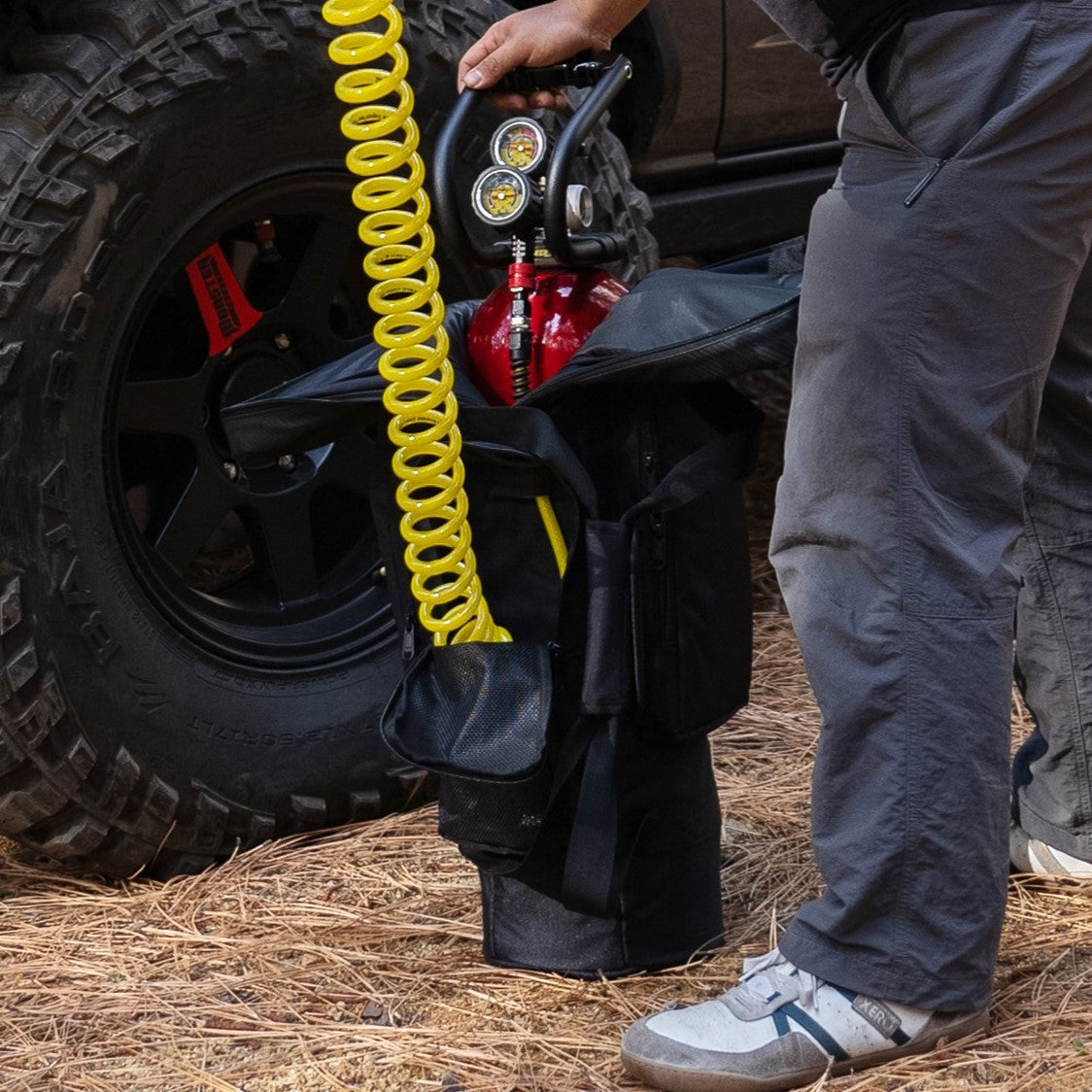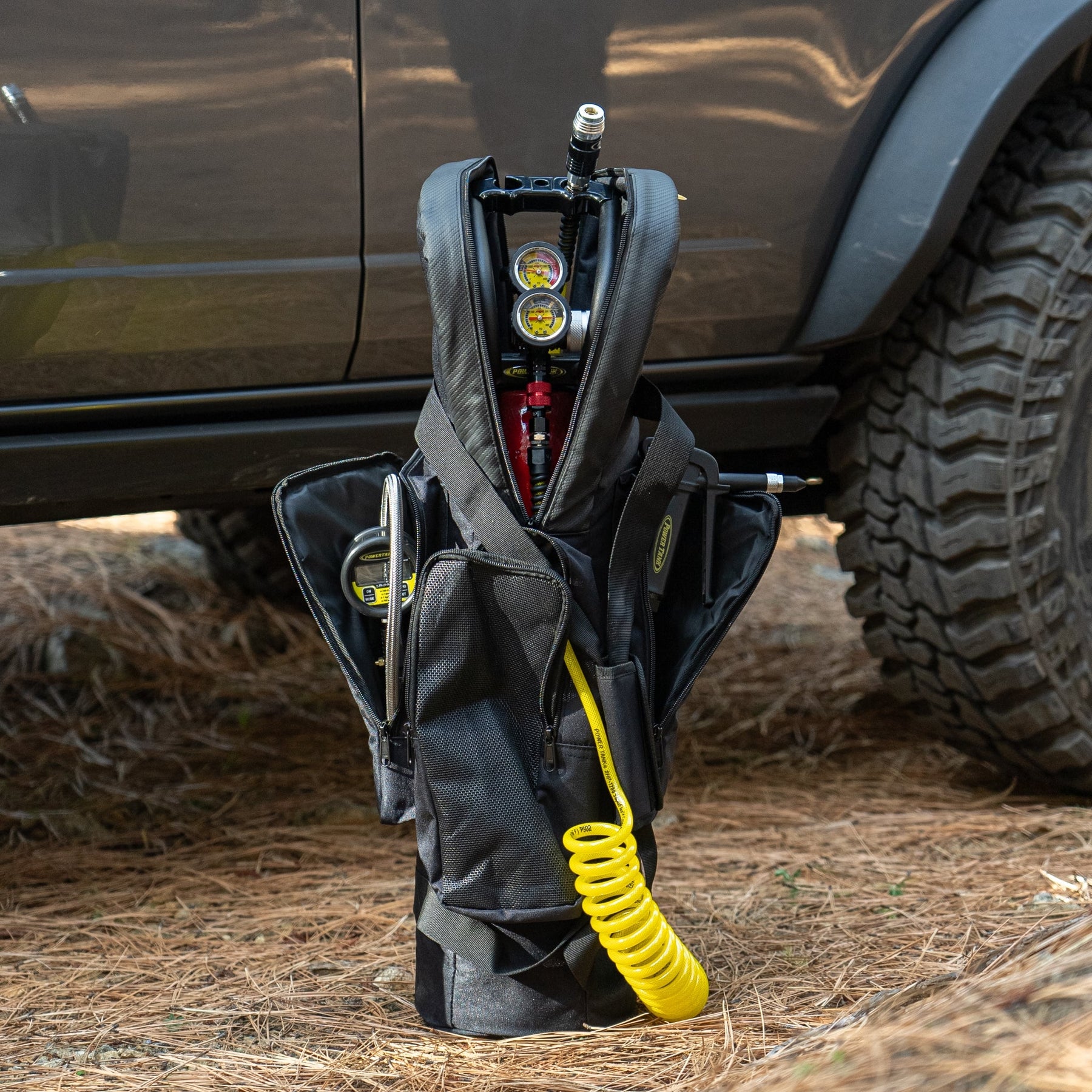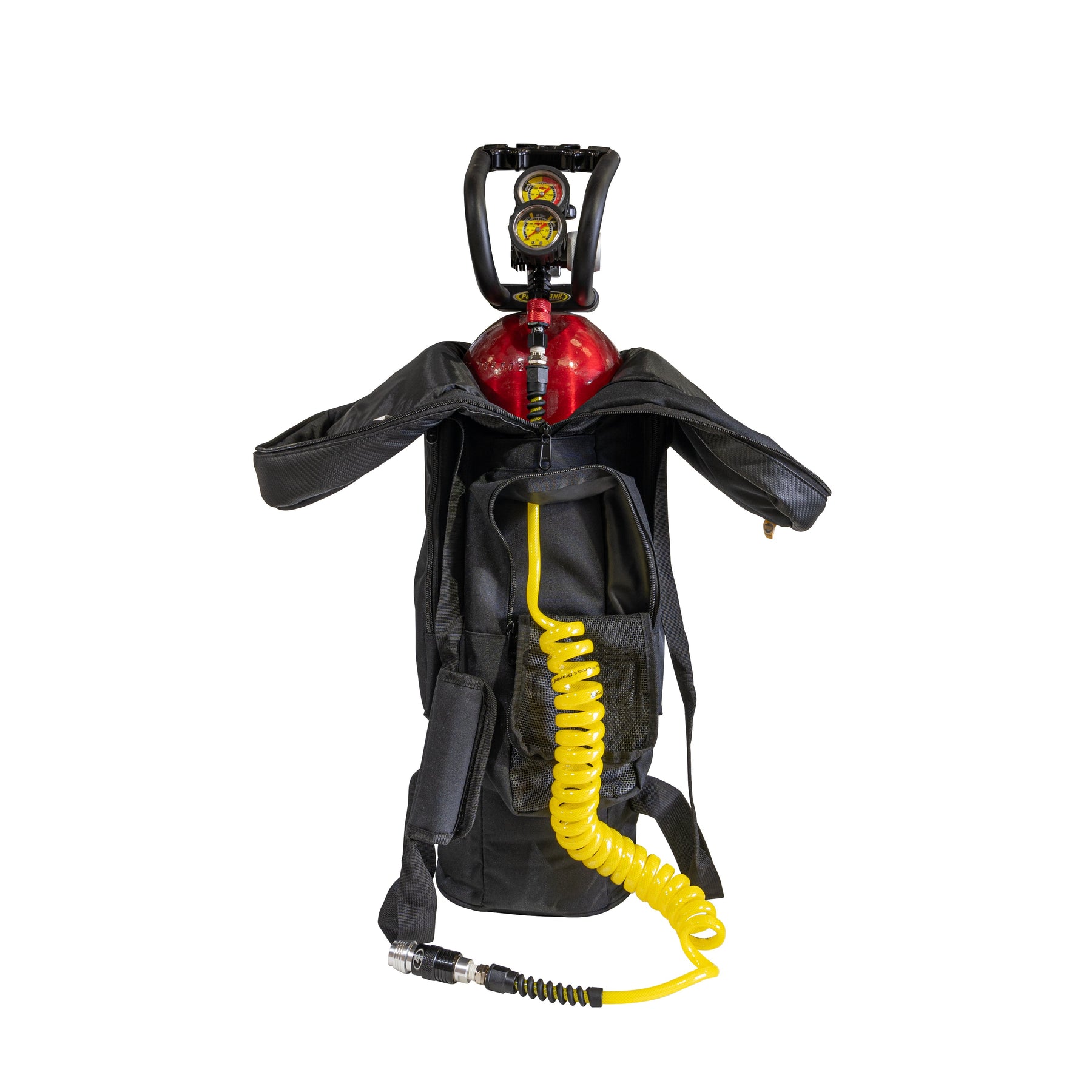 The new and improved Speed Bag for 15 lb Power Tanks is perfect if your Power Tank is more of a mobile tool being carried from place to place or from vehicle to vehicle. Features a main compartment with 1/4 inch foam padding, larger front mesh hose pocket with pass-through, and two zippered side pockets for your Ventoso Tire Inflator and other tools. With the hose-pass through, your Power Tank is always ready to go. Unzip the top for full access to your regulator and valve and pull the hose out of the mesh pocket. Made of abrasion resistant ballistic nylon with an equally hardwearing carbon top cover, heavy duty nylon carry handles, and YKK zippers.