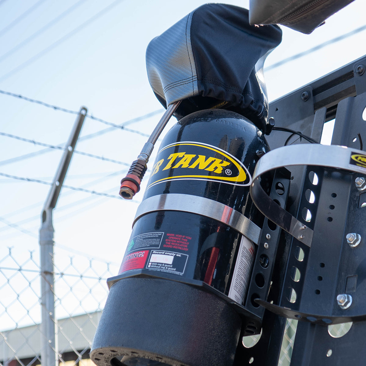 The Stiffy is our solution for the Power Tank power user who really puts their equipment through its paces. It is a 10 in. flexible stainless steel braided line extension which sits between your regulator and the Power Flow 3 coupler that you plug your Power Tank hose in to. If you have used your Power Tank for an extended period, you may have noticed a small bit of leaking through the standard regulator coupler. This is from the cold temperatures of CO2 hardening the rubber seal within the coupler, causing it to leak when you pull the hose to one side.
