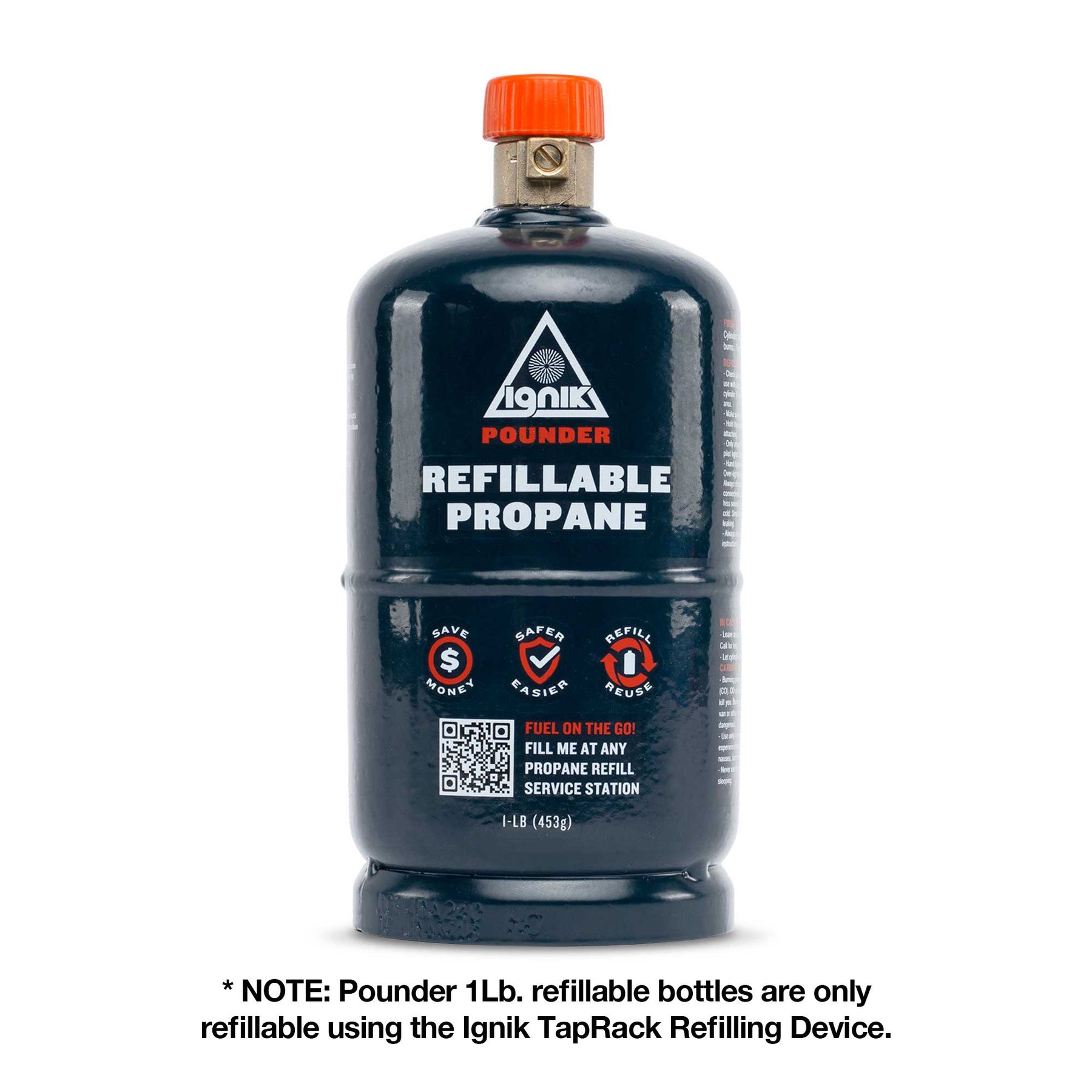 * NOTE: Pounder 1Lb. Refillable bottles are only refillable using the Ignik TapRack Refilling Device. The TapRack is not compatible with single-use or other refillable small propane bottles.