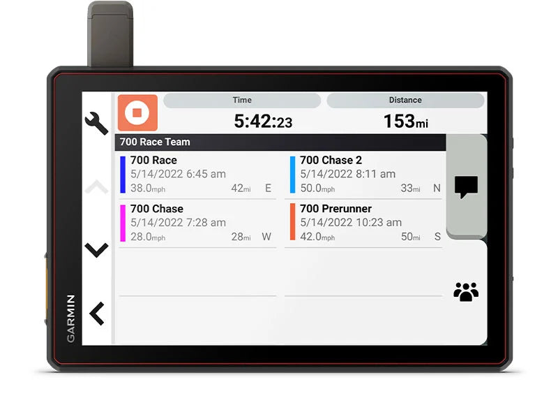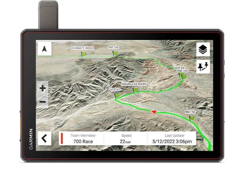 Team tracking with built-in inReach® technology allows race vehicles and chase trucks to message and track each other with live position updates1.