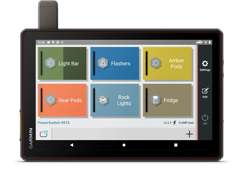 Tread XL works with the Garmin PowerSwitch™ digital switch box (sold separately) to control your vehicle’s 12-volt accessories, such as rock lights, fans and air pumps.