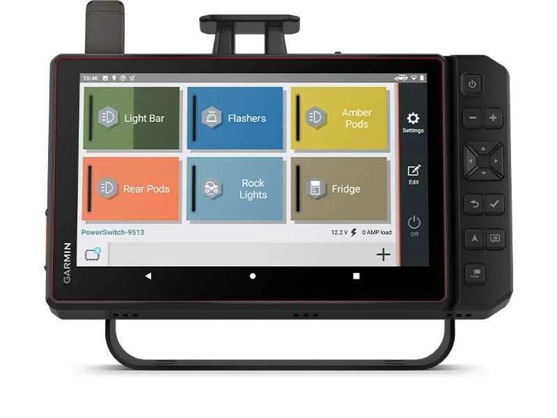 Tread XL works with the Garmin PowerSwitch™ digital switch box (sold separately) to control your vehicle’s 12-volt accessories, such as rock lights, fans and air pumps.