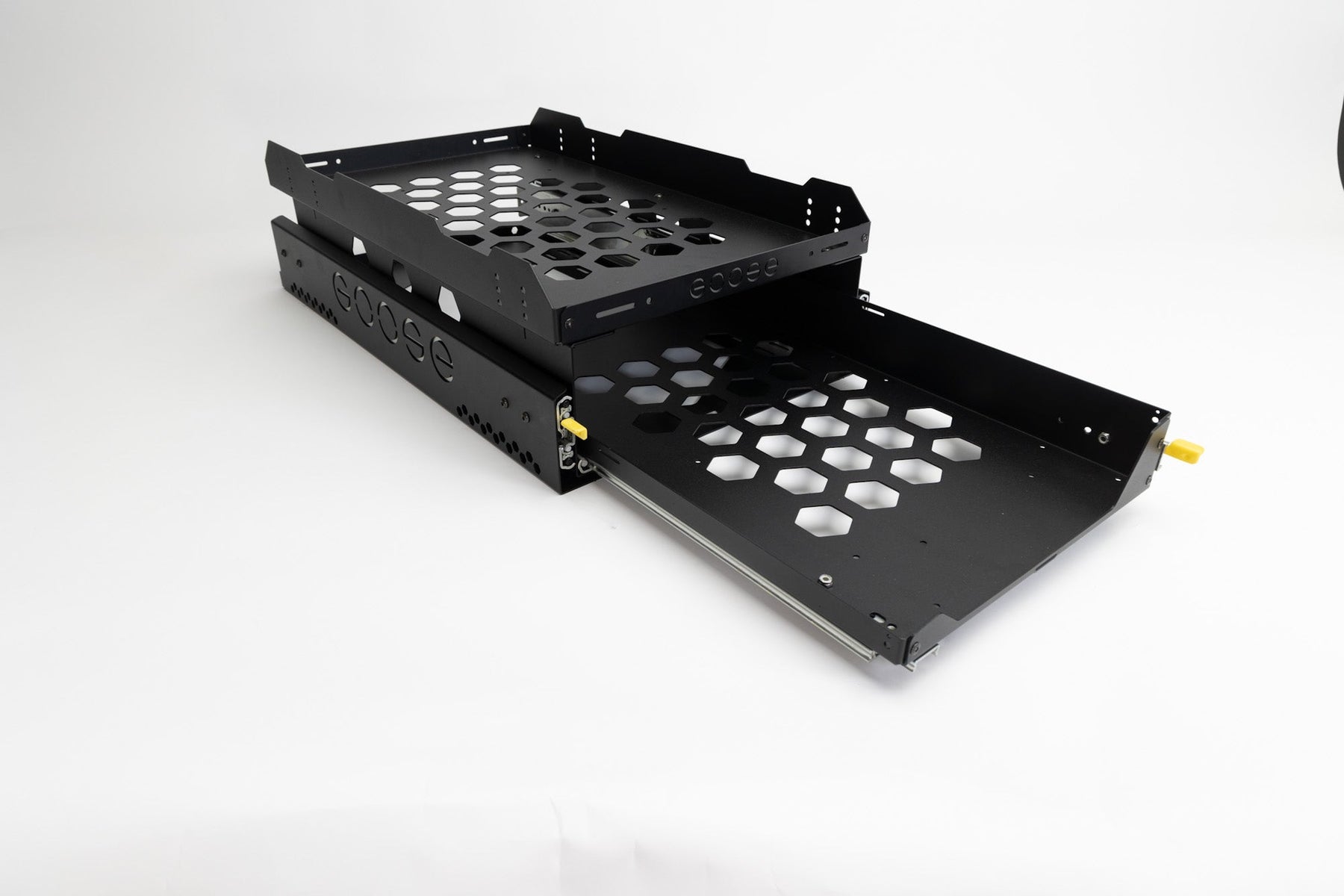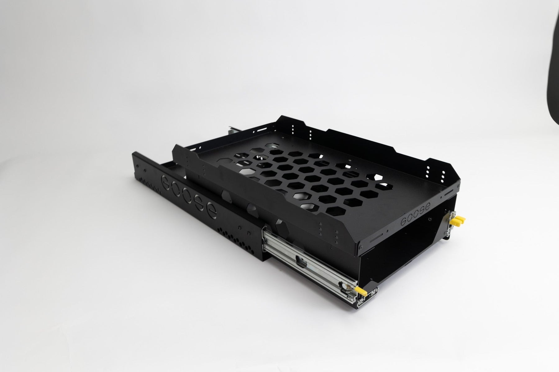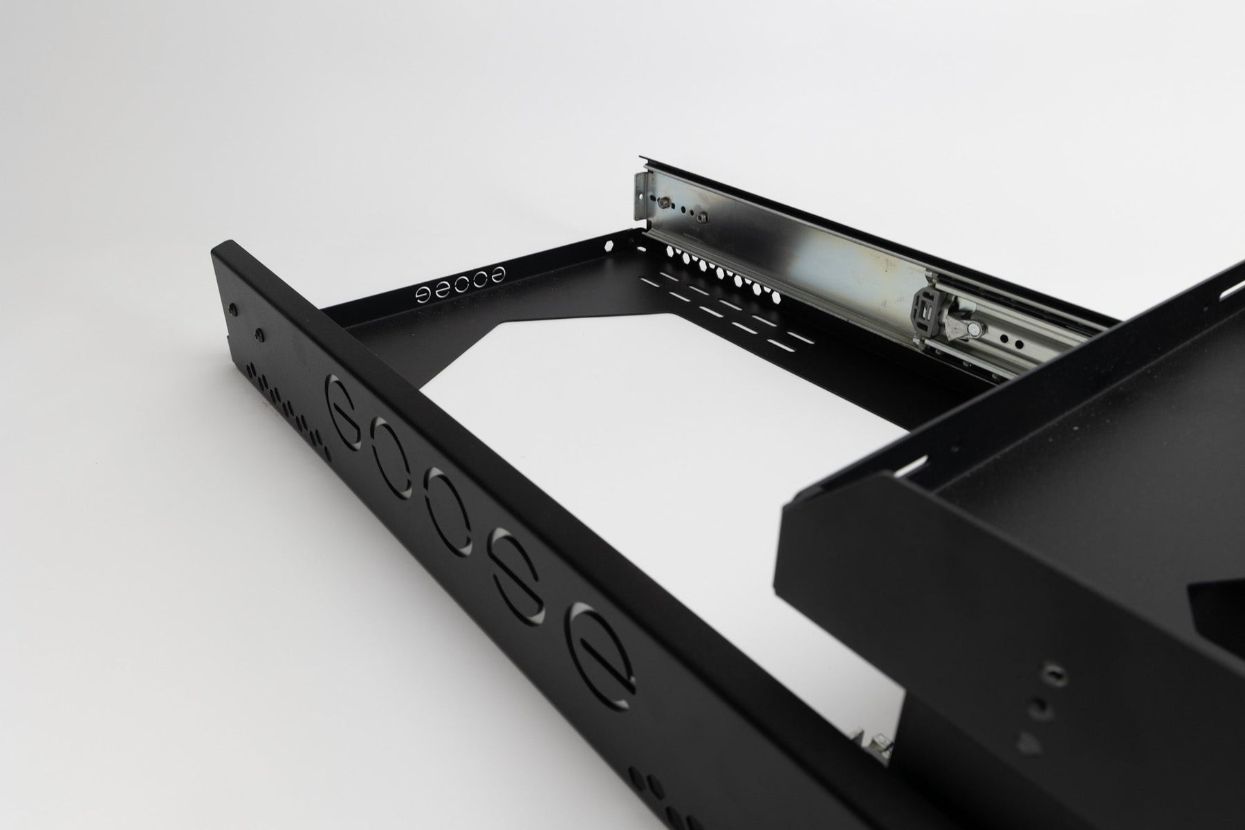 The Solo CampKitchen low profile refrigerator and stove slides that is designed to mount to the Goose Gear Plate System. It features a full extension tray with Lock-In/Lock-Out capability.