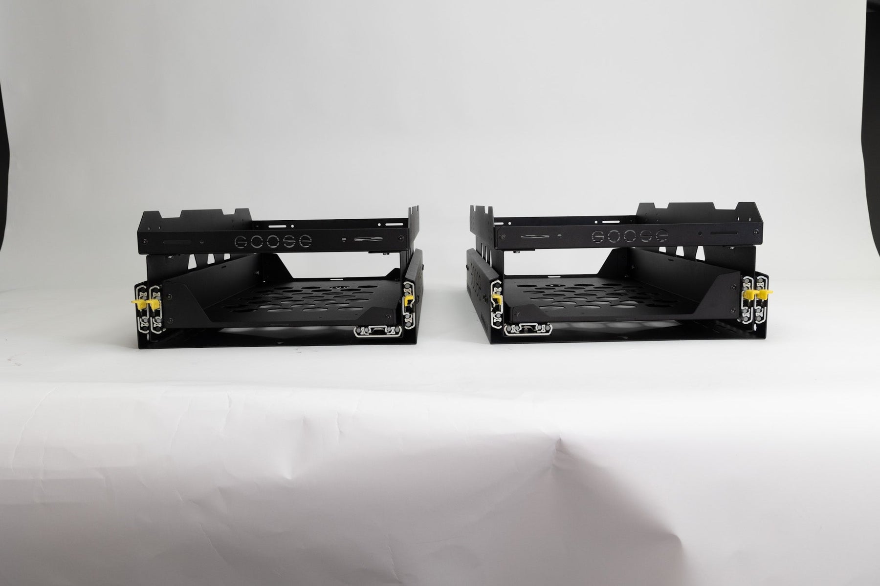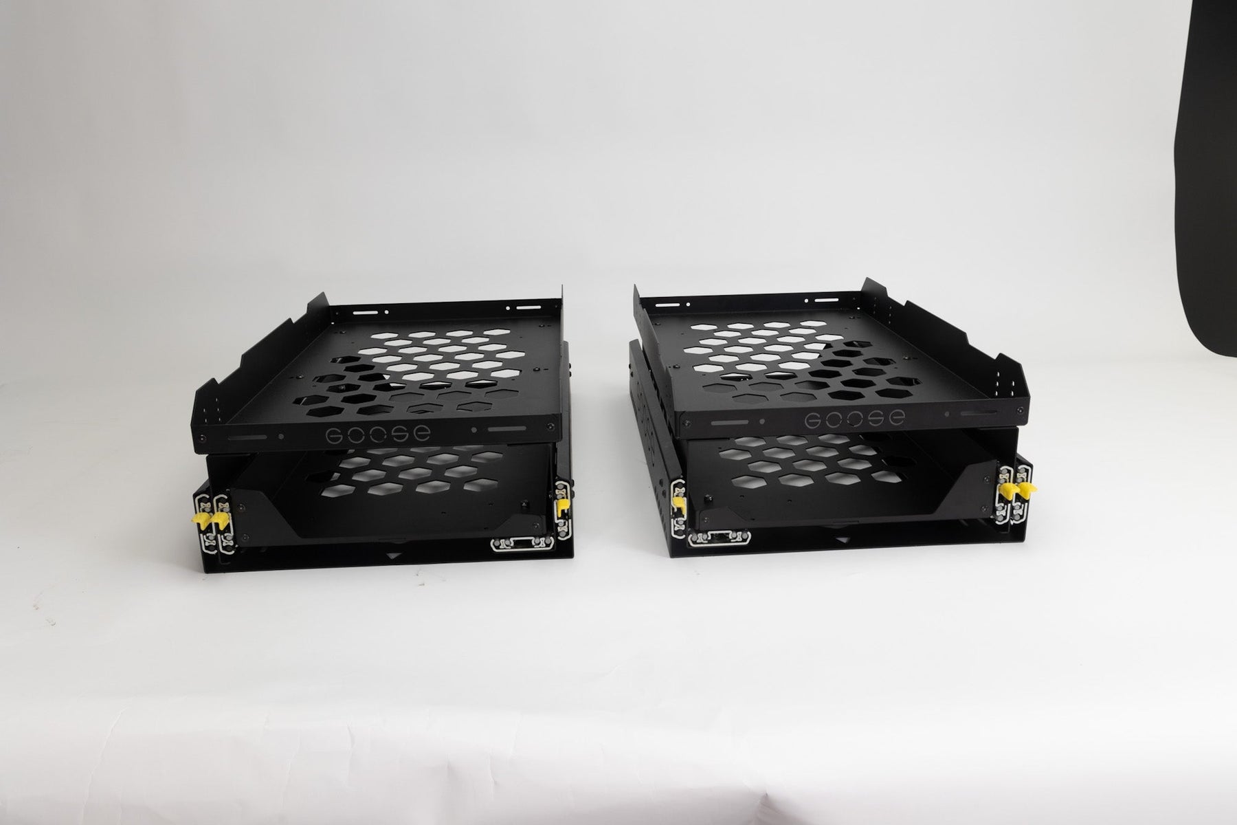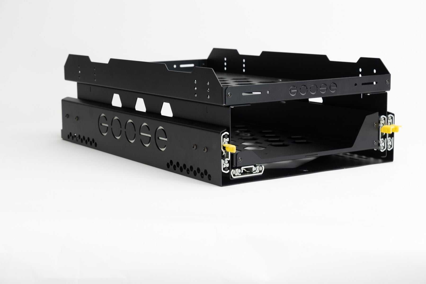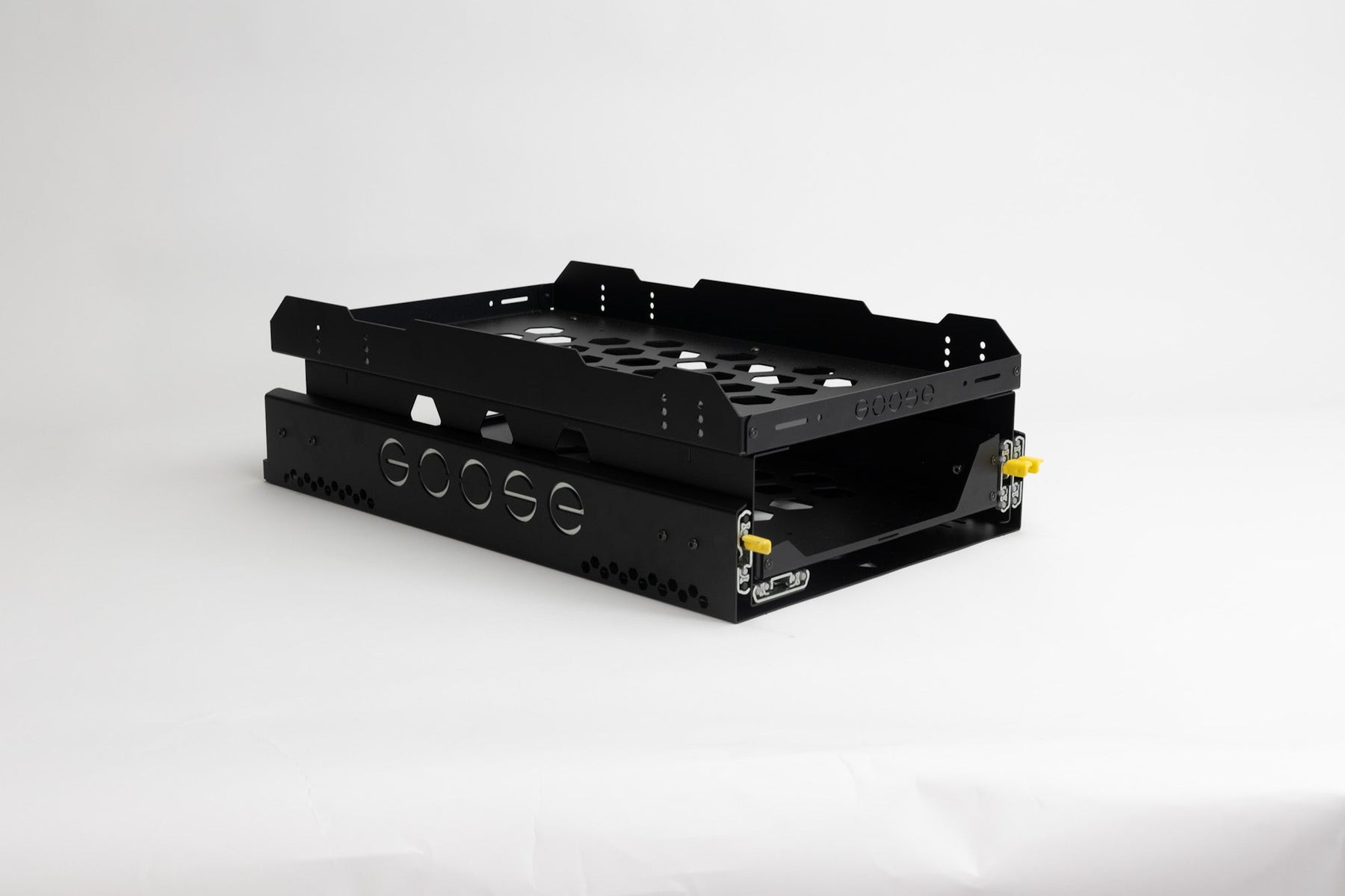 The Solo CampKitchen low profile refrigerator and stove slides that is designed to mount to the Goose Gear Plate System. It features a full extension tray with Lock-In/Lock-Out capability.