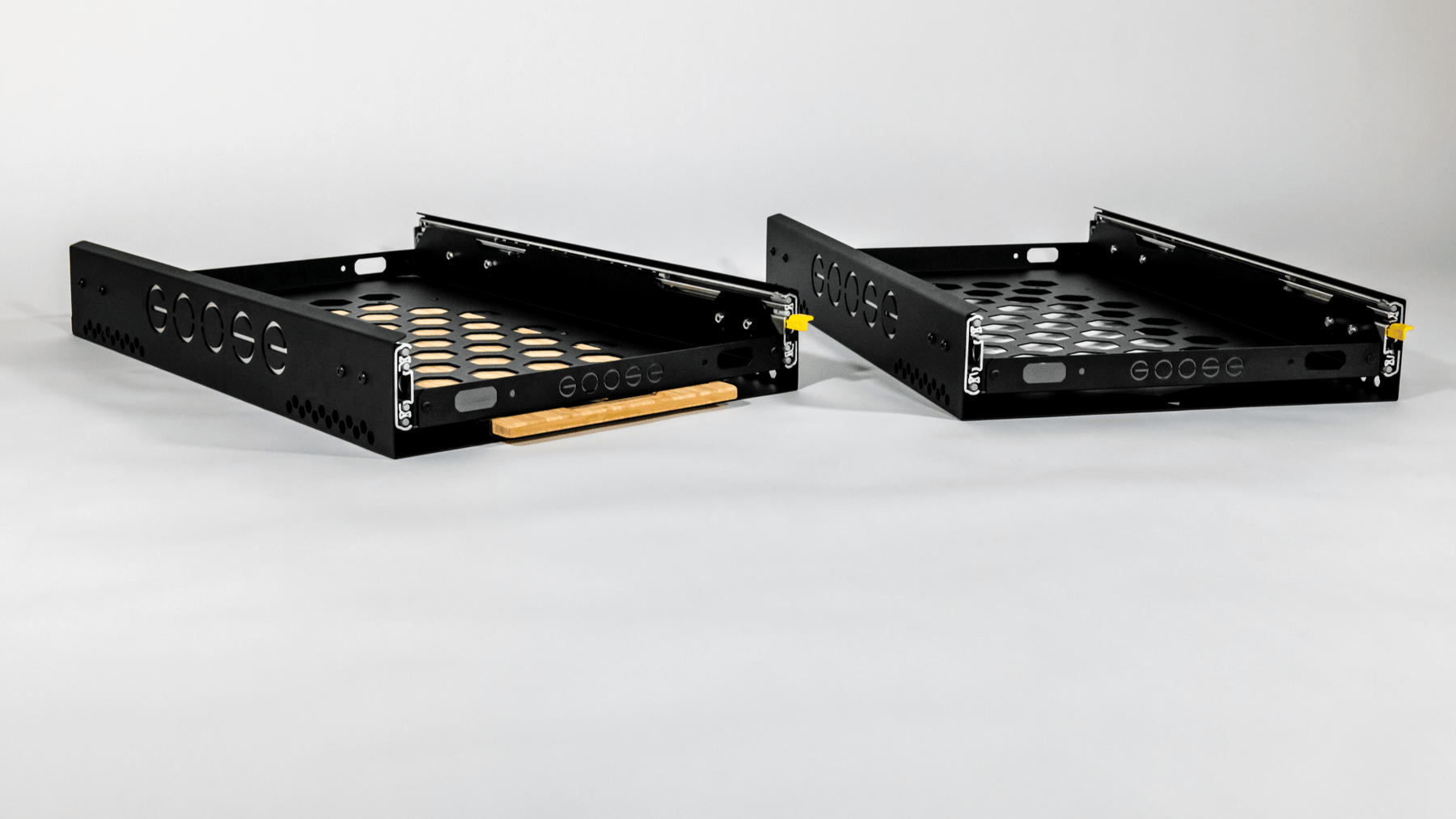 Solo Fridge Slides come with hardware to secure them to nearly any Goose Gear Rear Plate. Some earlier models may require drilling, but we have done our best to accommodate nearly all of the existing and legacy plates into the design for ease of installation.