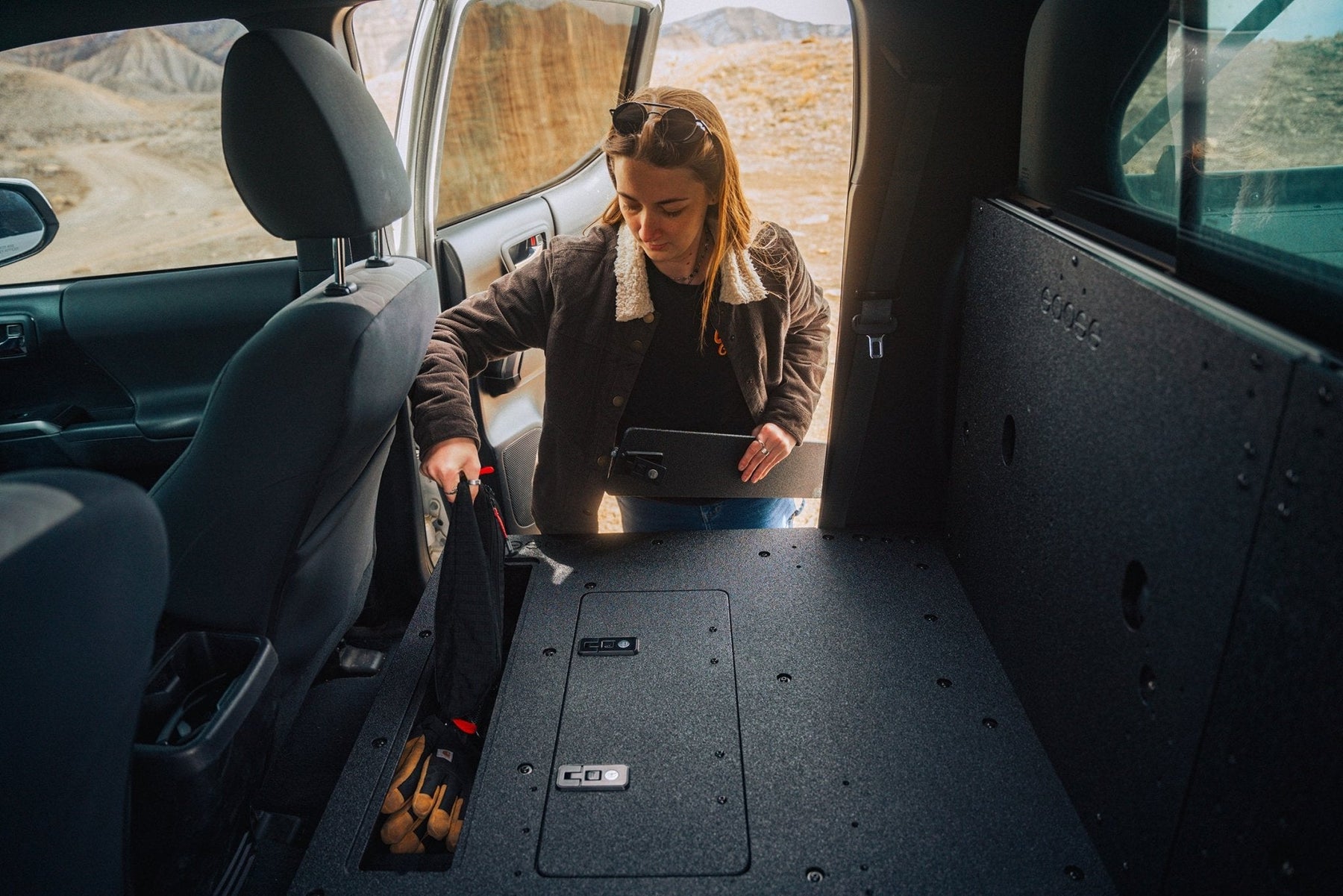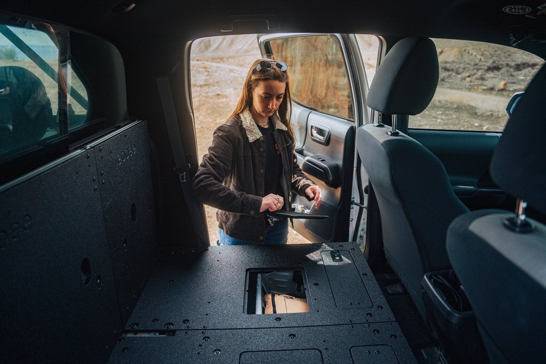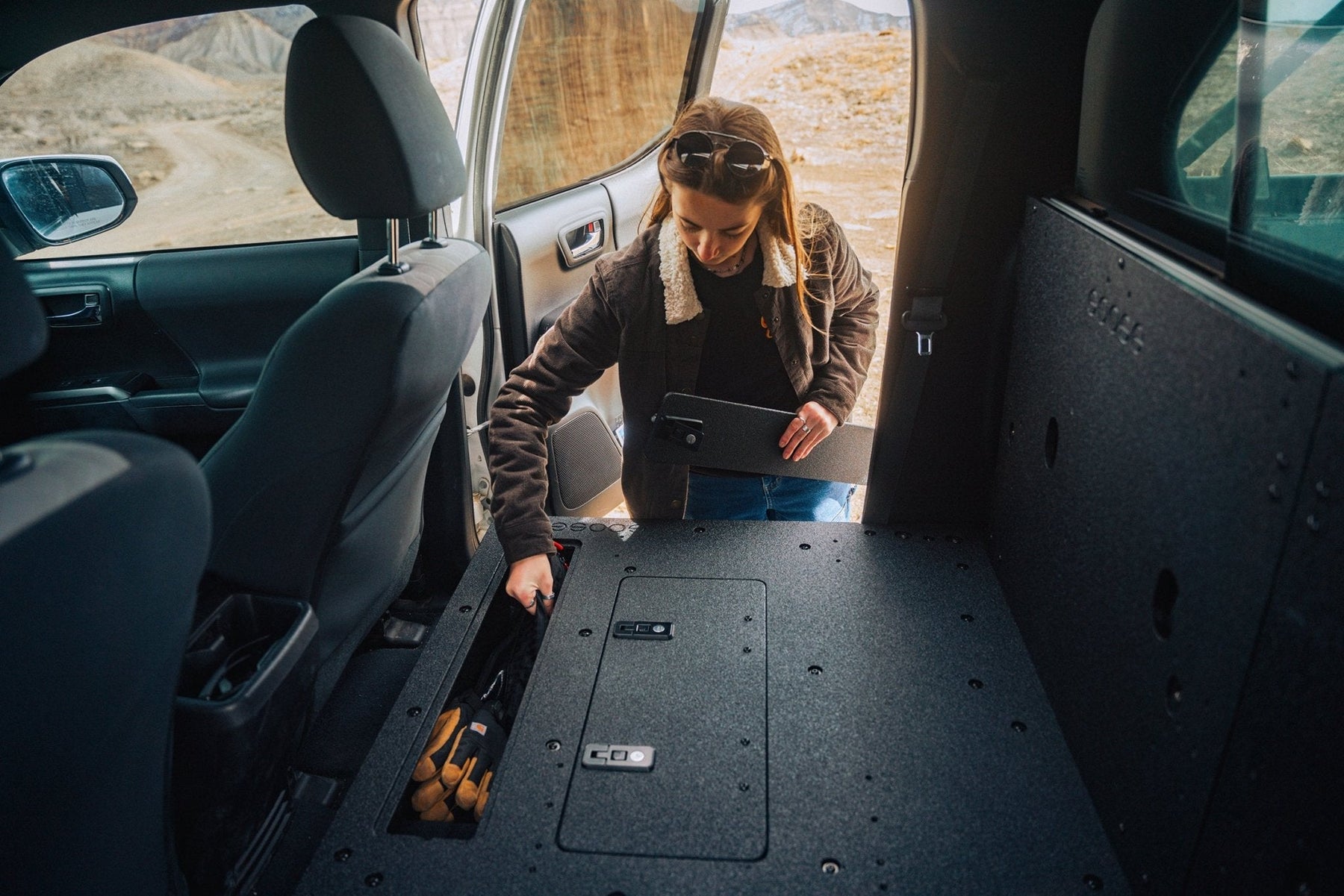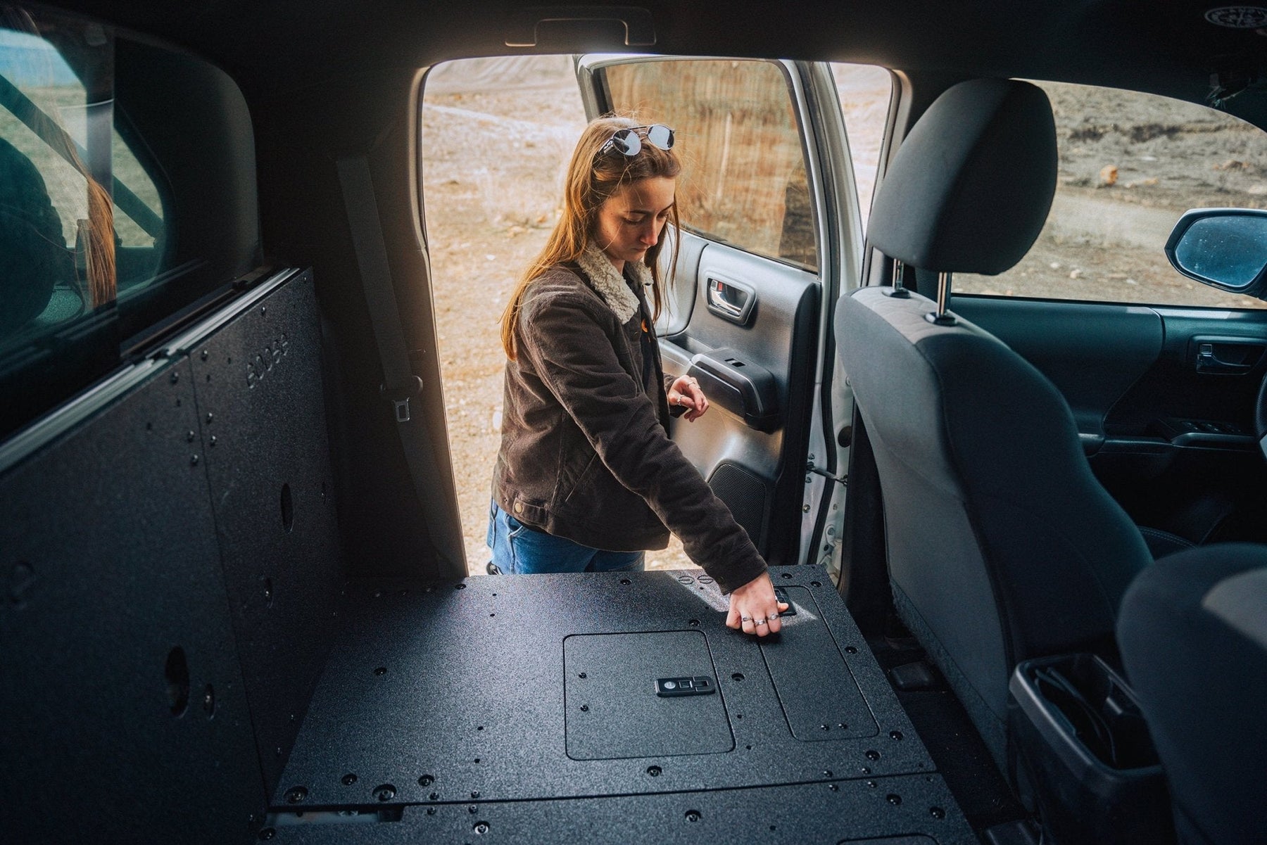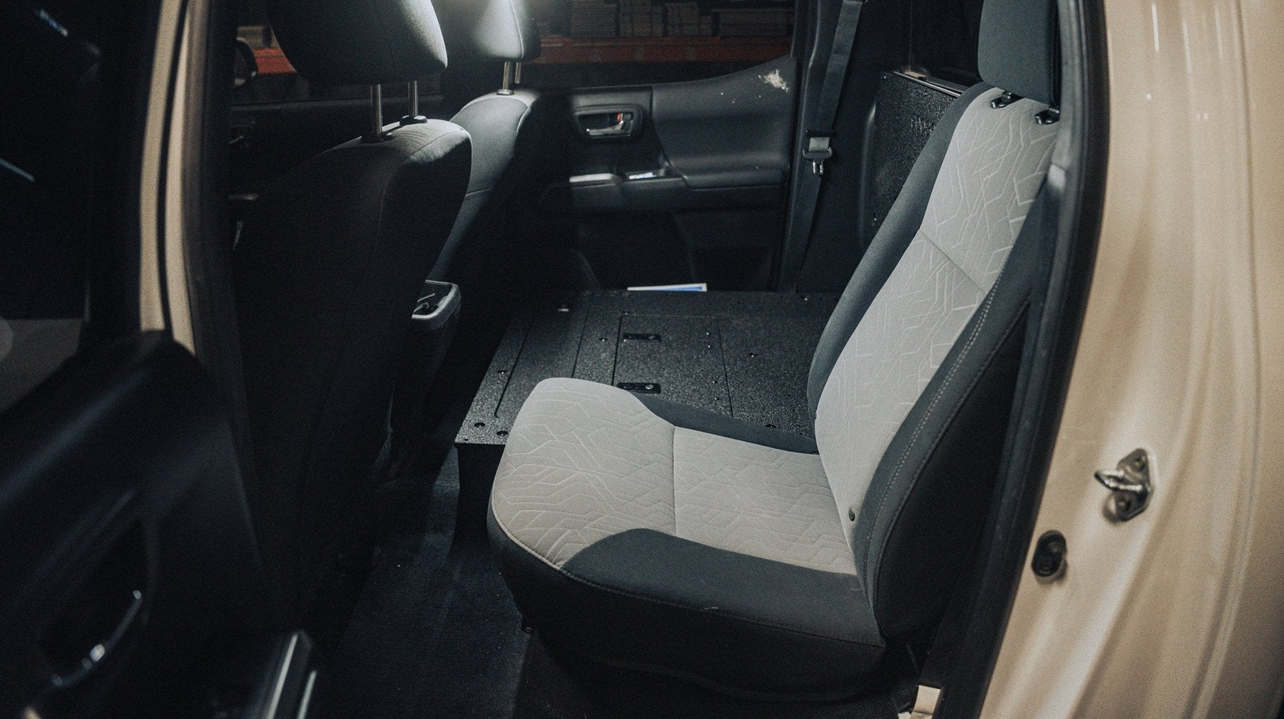 Toyota Tacoma 2nd and 3rd Gen. Double Cab Second Row Seat Delete Plate System is designed to create a flat platform that you can use to secure your gear, for the dog's bed and can also be used to store your refrigerator of cooler as well as drawer module options.