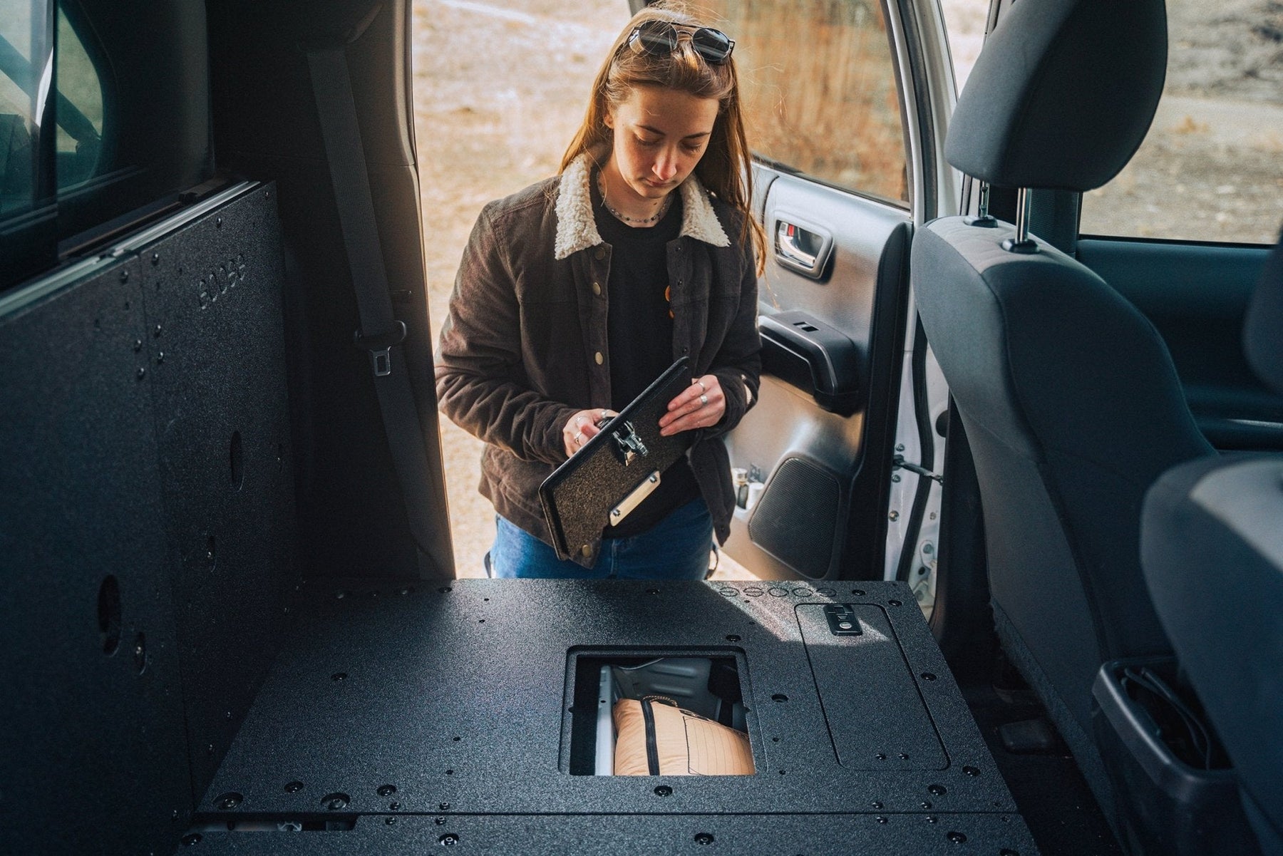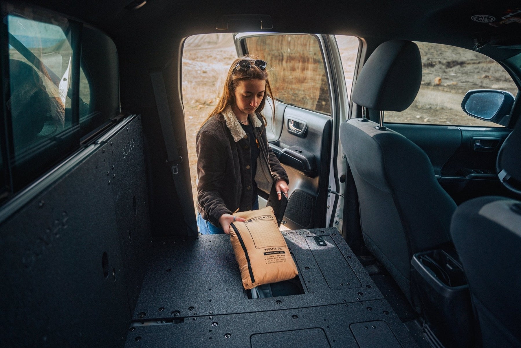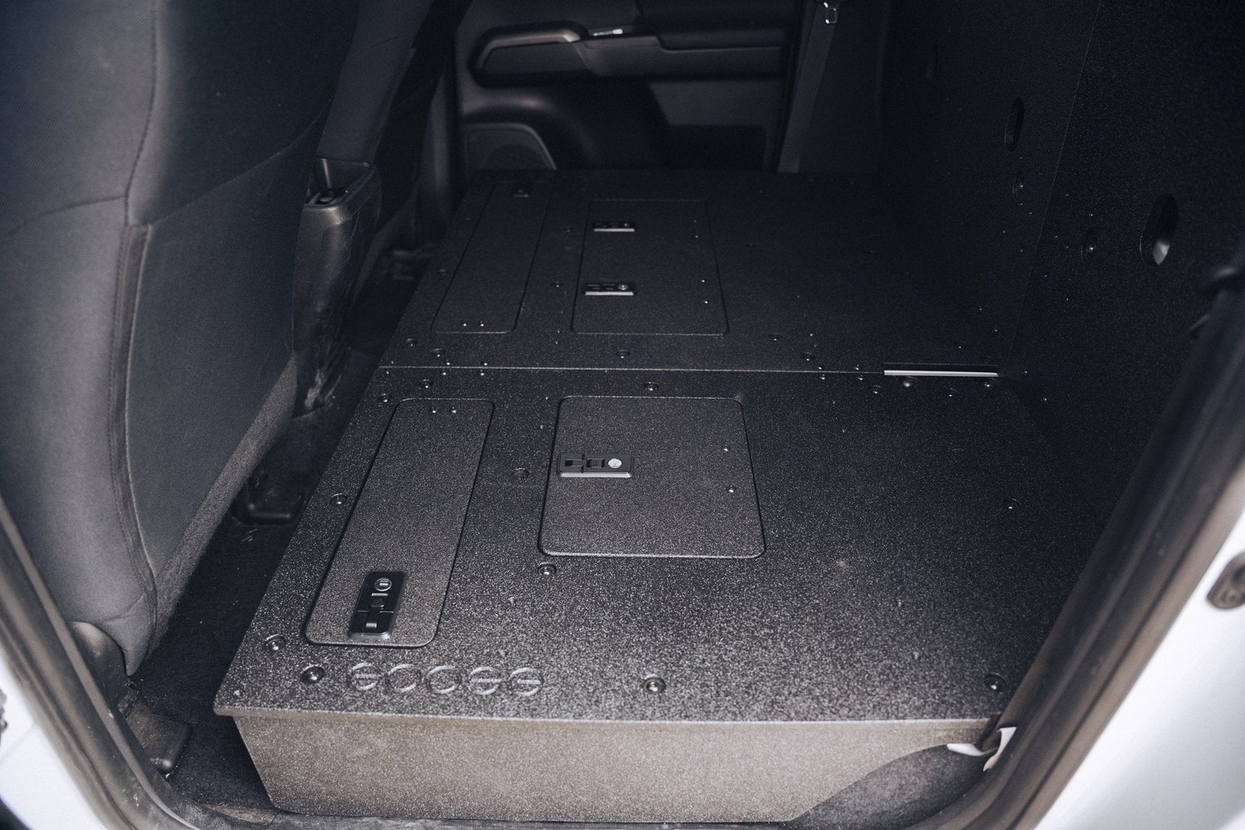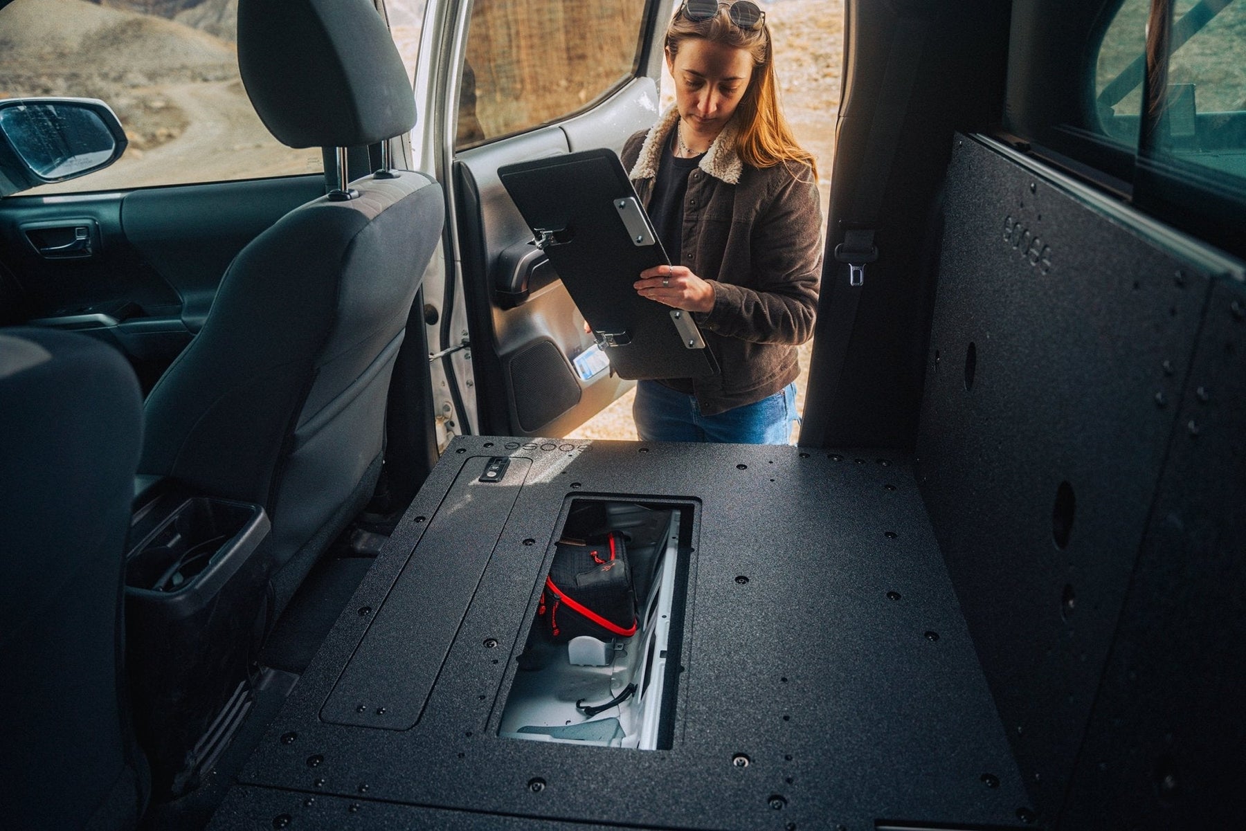 Toyota Tacoma 2nd and 3rd Gen. Double Cab Second Row Seat Delete Plate System is designed to create a flat platform that you can use to secure your gear, for the dog's bed and can also be used to store your refrigerator of cooler as well as drawer module options.