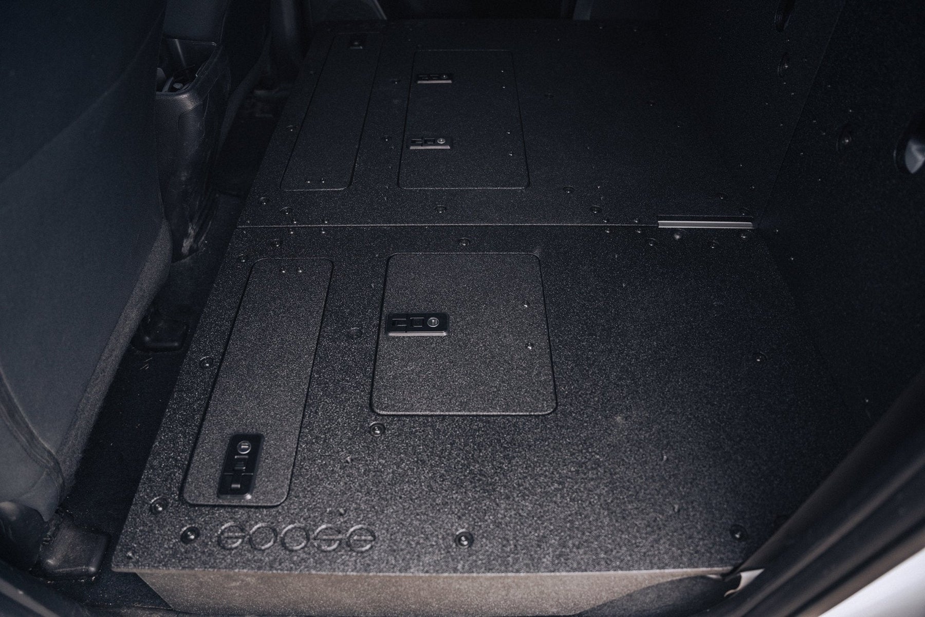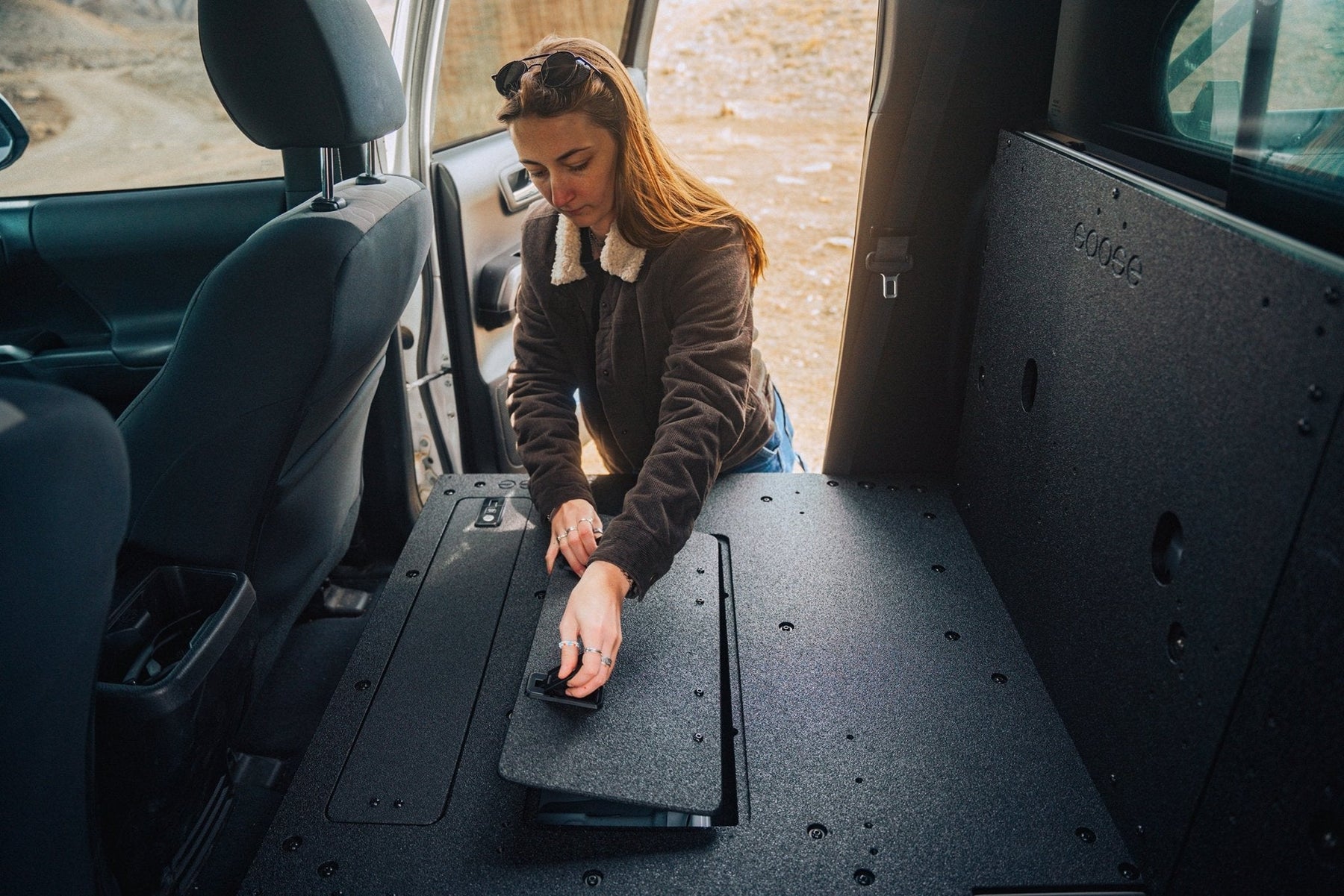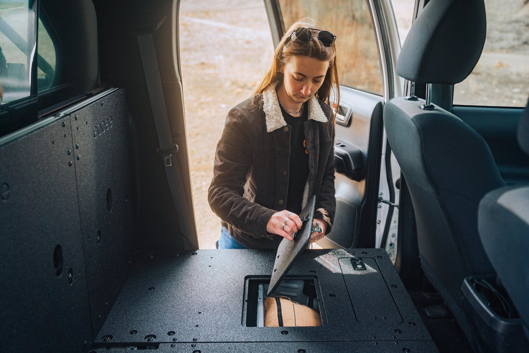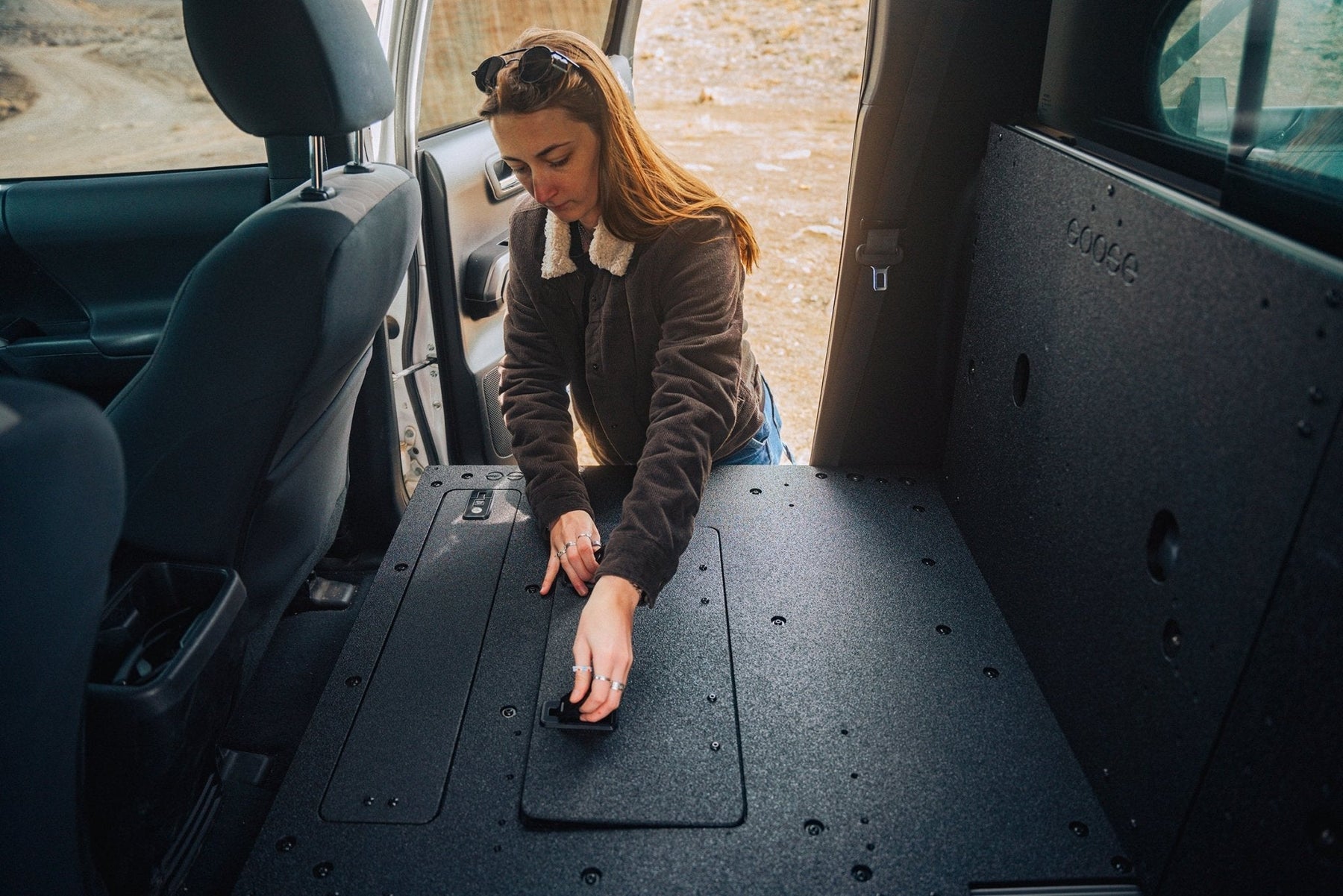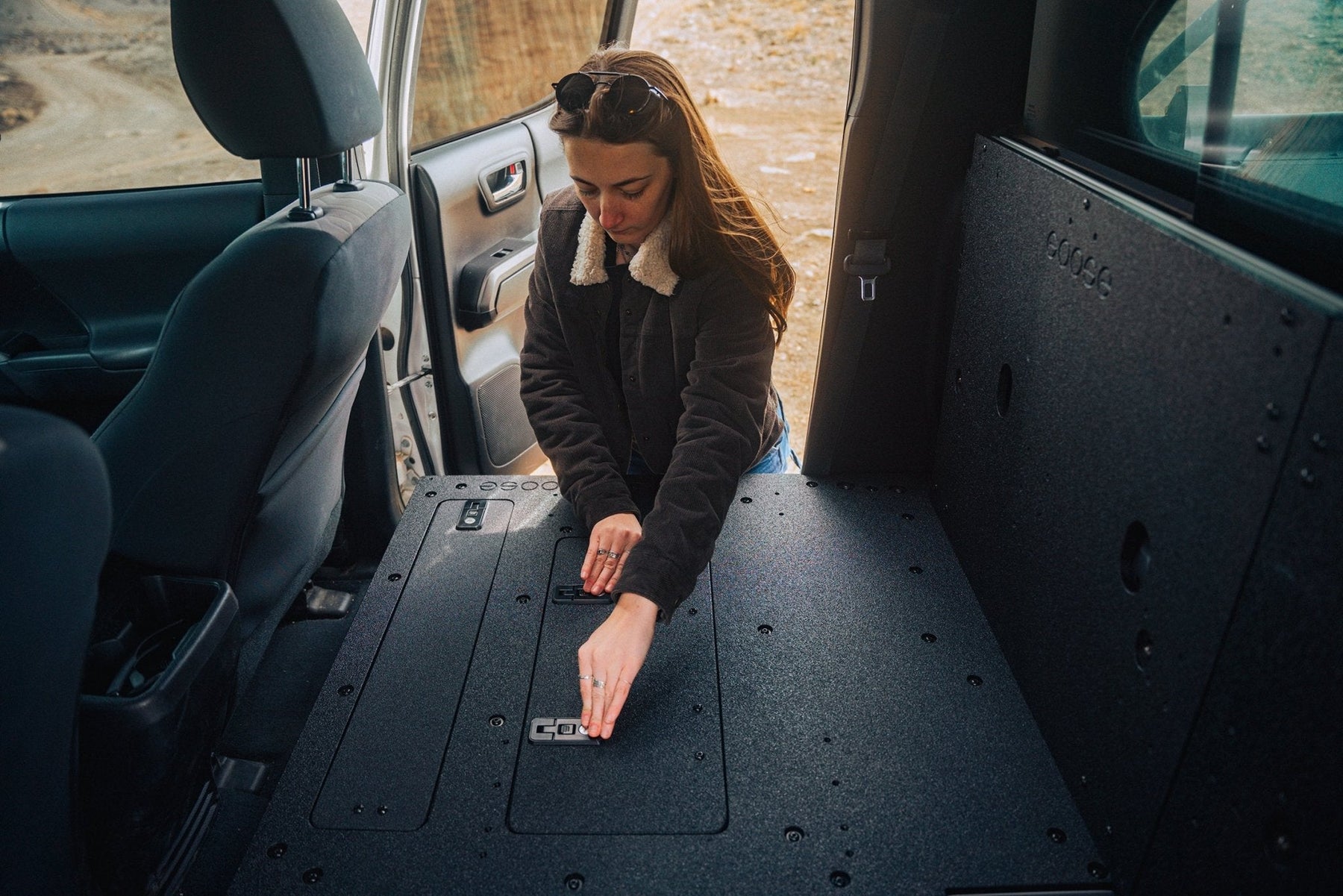 Toyota Tacoma 2nd and 3rd Gen. Double Cab Second Row Seat Delete Plate System is designed to create a flat platform that you can use to secure your gear, for the dog's bed and can also be used to store your refrigerator of cooler as well as drawer module options.