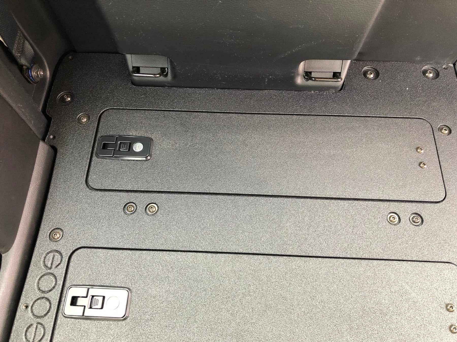 The Second Row Seat Delete Plate System is designed to create a flat platform that you can use to secure your gear, for the dogs bed and can also be used to store your refrigerator of cooler.