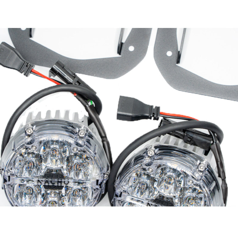 The NACHO Plug N Play Kit is exactly that. This kit comes with everything needed to swap out your stock fog lights in your single piece Jeep JL JT bumper and bring style and more usable output to your fog lights. The kit consists of 2 Quatro SAE Amber lens lights, 2 mounting brackets, OEM connectors for the lights to plug directly into the factory fog light plug. This makes for a quick and easy swap while maintaining the factory switching and the piece of mind. The Quatro SAE is still equipped with our TRL or Trail Running Light and includes a light connector and fuse tap harness to power the TRL to your auxiliary power. Increase performance, visibility, and style.