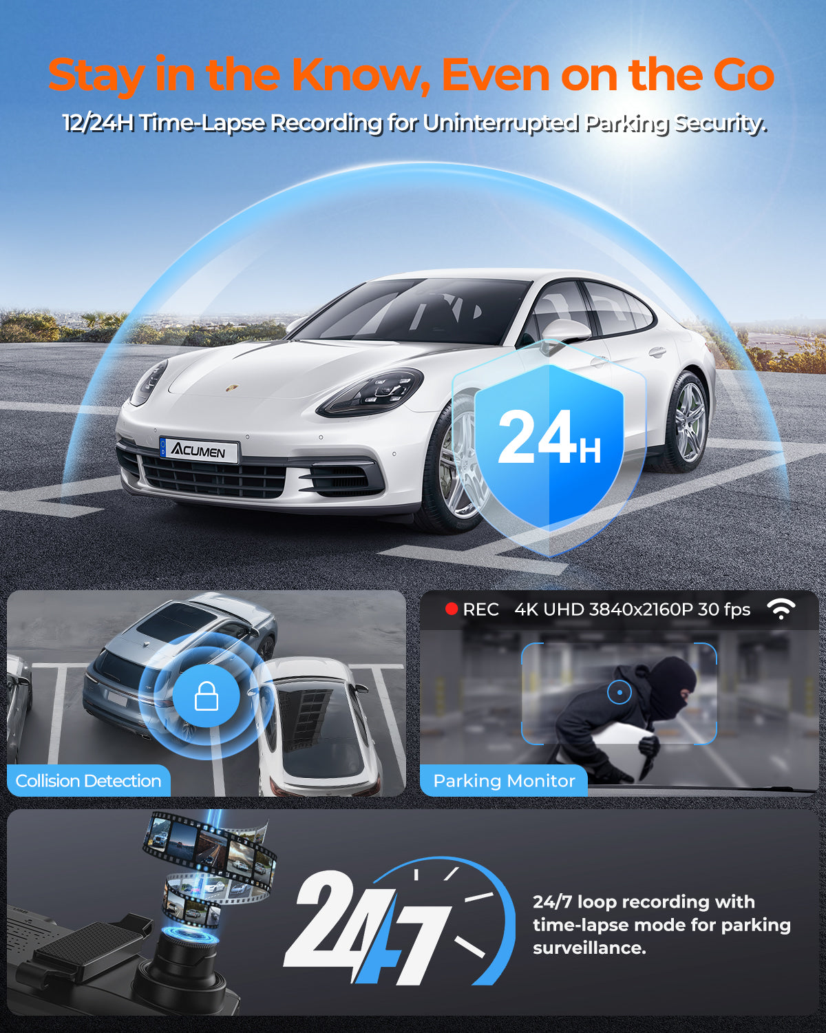 The Acumen XR10 Pro is a state-of-the-art rearview mirror camera system crafted to provide exceptional visuals and safety for drivers in diverse conditions, from urban roads to light off-road trails. The XR10 Pro features a front camera with a starvis-grade CMOS sensor, a high-performance ISP processor, and a 6-layer full-glass wide-angle lens, delivering stunning 4K video (3840×2160P@30fps) for clear license plates and road signs. Its 2K rear camera, equipped with Ultra HD WDR and a 170° wide-angle lens, offers a 1.5x larger view than traditional mirrors, reducing blind spots with glare-free night vision. The XR10 Pro boasts a 10-inch 2.5D curved LCD touchscreen, providing three times the viewing area of standard mirrors and responsive touch controls. With 24/7 video protection, the XR10 Pro records continuously, overwriting old footage, while a G-sensor locks collision videos and time-lapse mode saves battery when parked. A built-in GPS tracks speed and location, reviewable via app, and its supercapacitor ensures durability from -4°F to 158°F. Compatible with cars, trucks, and SUVs, the XR10 Pro includes a 64GB memory card and a 2-year warranty.