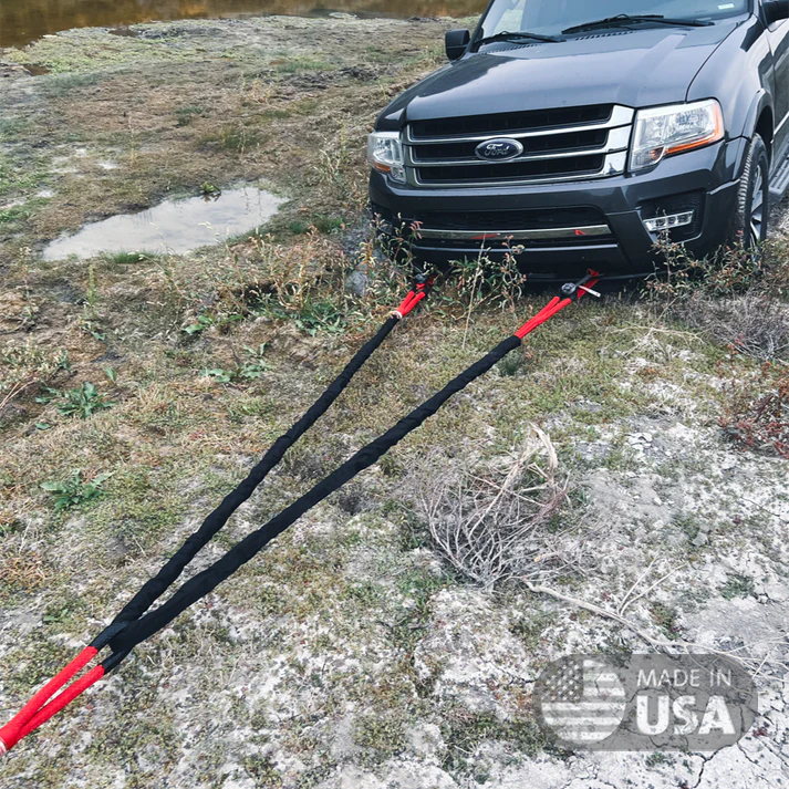 Stuck? But like, real good? Yankum Ropes™ kinetic bridle will distribute the pulling forces on your stuck vehicle.