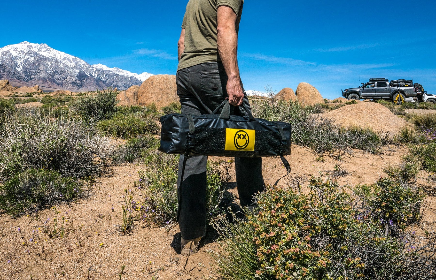 After the recovery, clean up the evidence with the Deadman Bodybag. Designed specially to hold the Deadman Earth Anchor or the Stretchy Band. The bag is large enough to carry your soft shackles, and some gloves, pretty much everything you need for a straight forward self-recovery. Strap it to your roll bars or throw it in the back of your rig & go!
