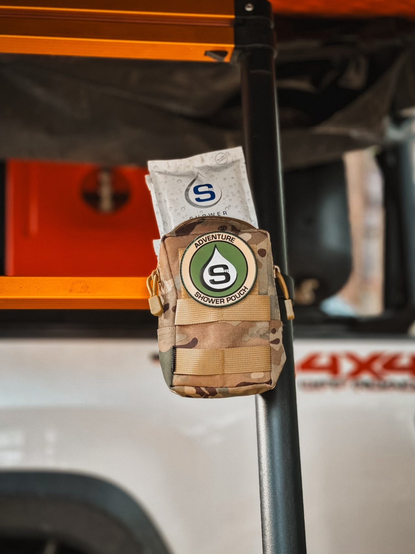 Tactical Molle Zipper Bag + Adventure Sampler Kit: 4 Shower Pouches, 1 Hand Sanitizer (80%), and 1 Deodorant