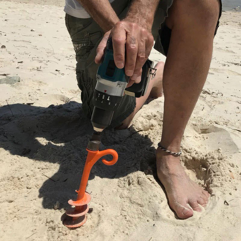 GroundGrabba Lite screws into the sand or loose soft ground using a good quality cordless drill (18V minimum with at least 45 ft-lb of torque) or by hand, providing a swift, safe, and secure set up along the beach or in dunes.