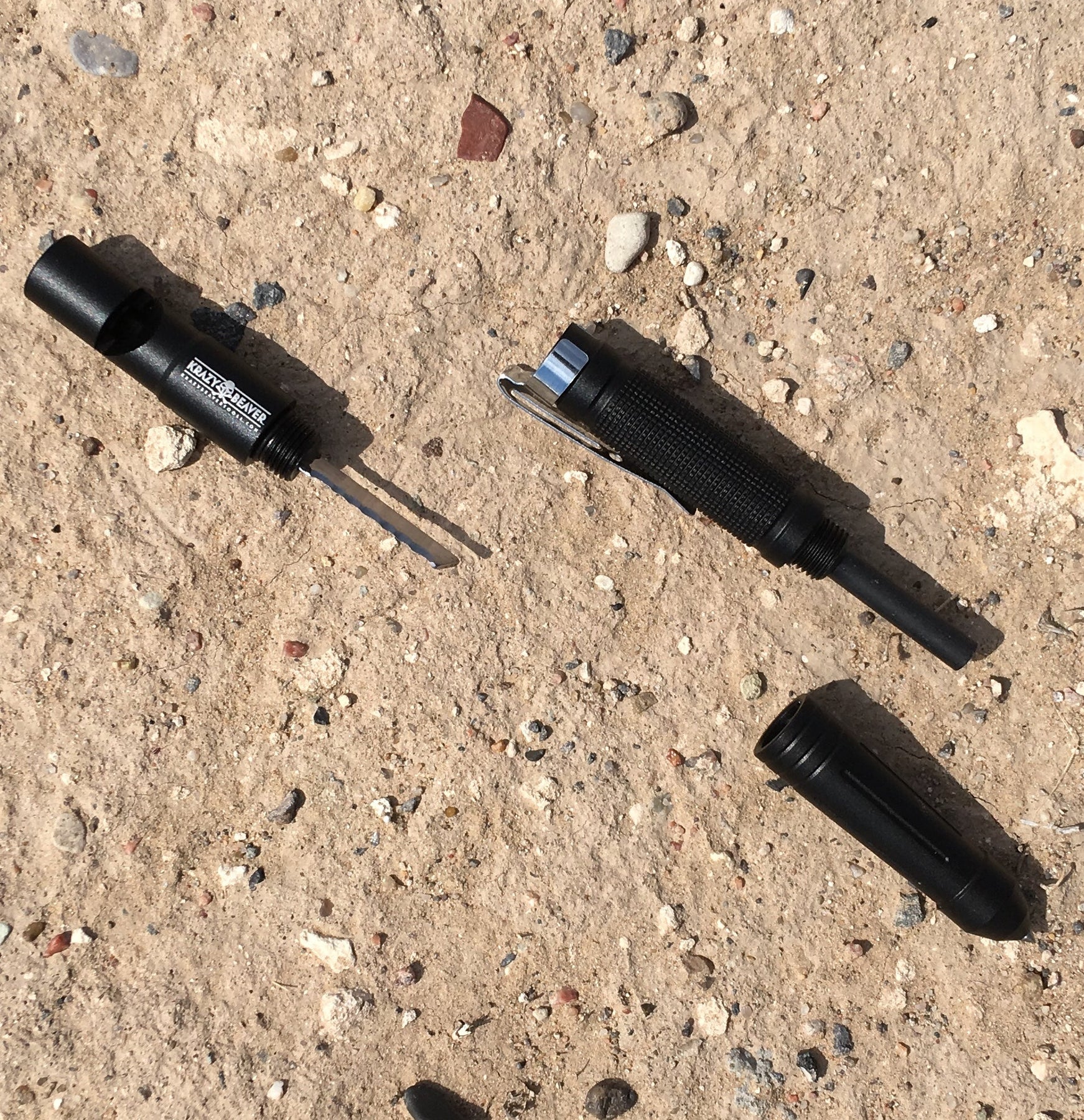 Check out our 4 in 1 fire starter! Its a perfect match for the Krazy Beaver Shovel handles. Just remove the D grip and install this and other emergency items in the handle. (We recommend placing this in a strong zip lock bag to keep it from rattling inside the handle). Made of aluminum with three water tight components.