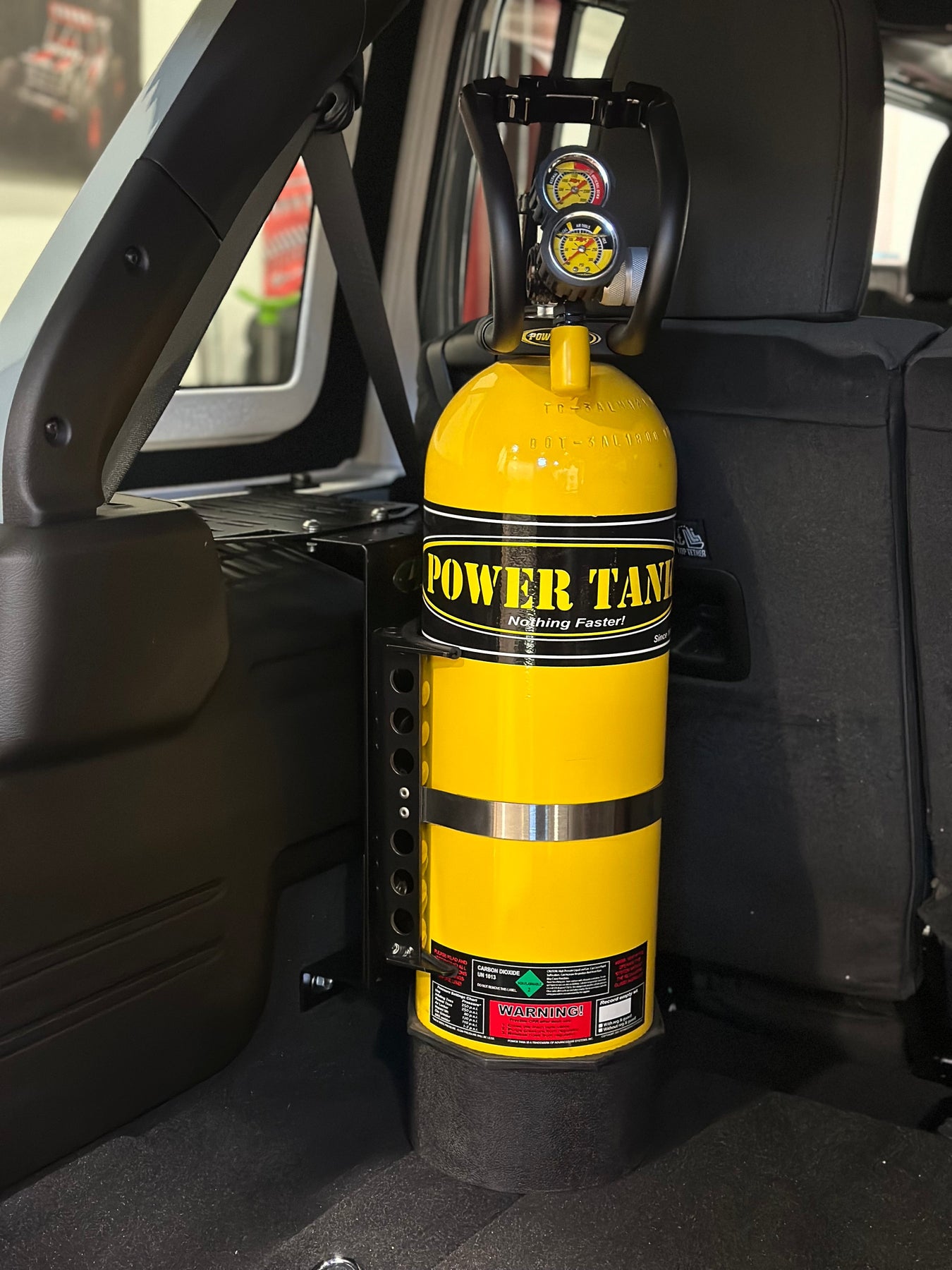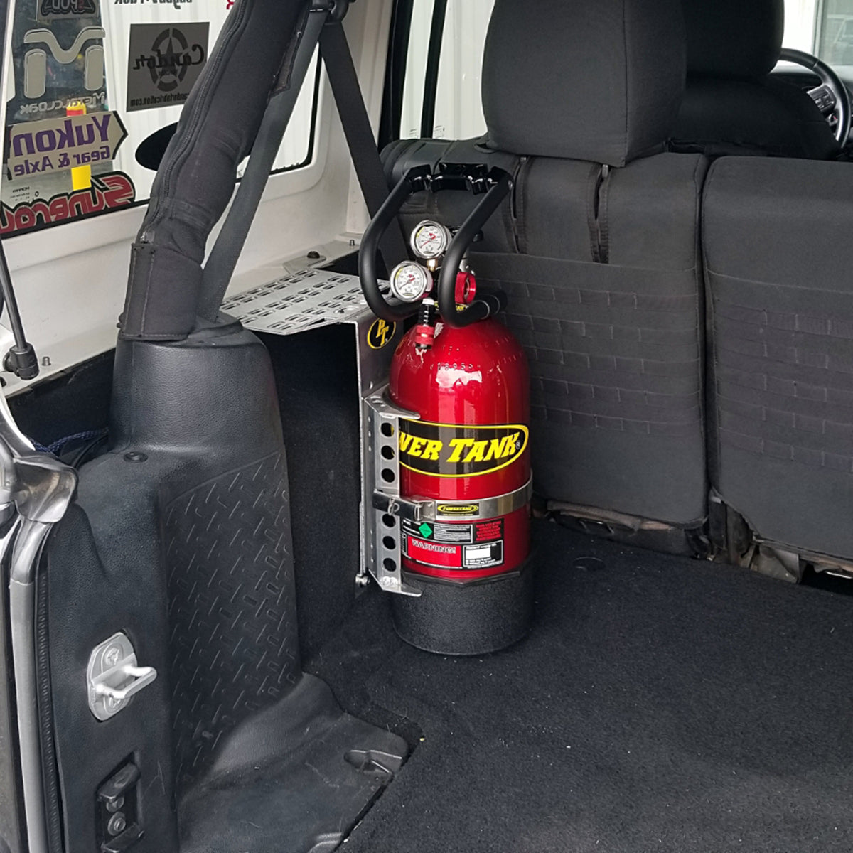 The Behind the Seat (BTS) Bracket is our favorite bracket design to date. The Jeep Wrangler has always been the most versatile vehicle on the market. With a few bolts, the doors come out, the windshield can fold down, and the top changes from hard top to soft top to no top. Our goal was to design a Power Tank mount that is just as versatile as your Jeep. This bracket has multiple adjustments to accommodate your 10, 15, or 20 lb. Power Tank in your JKU or JLU whether you're running the hard top, soft top, or topless.