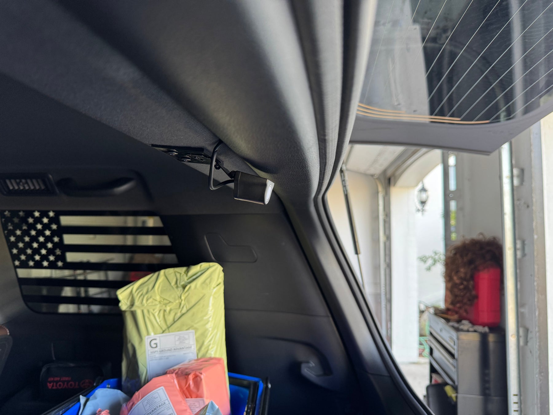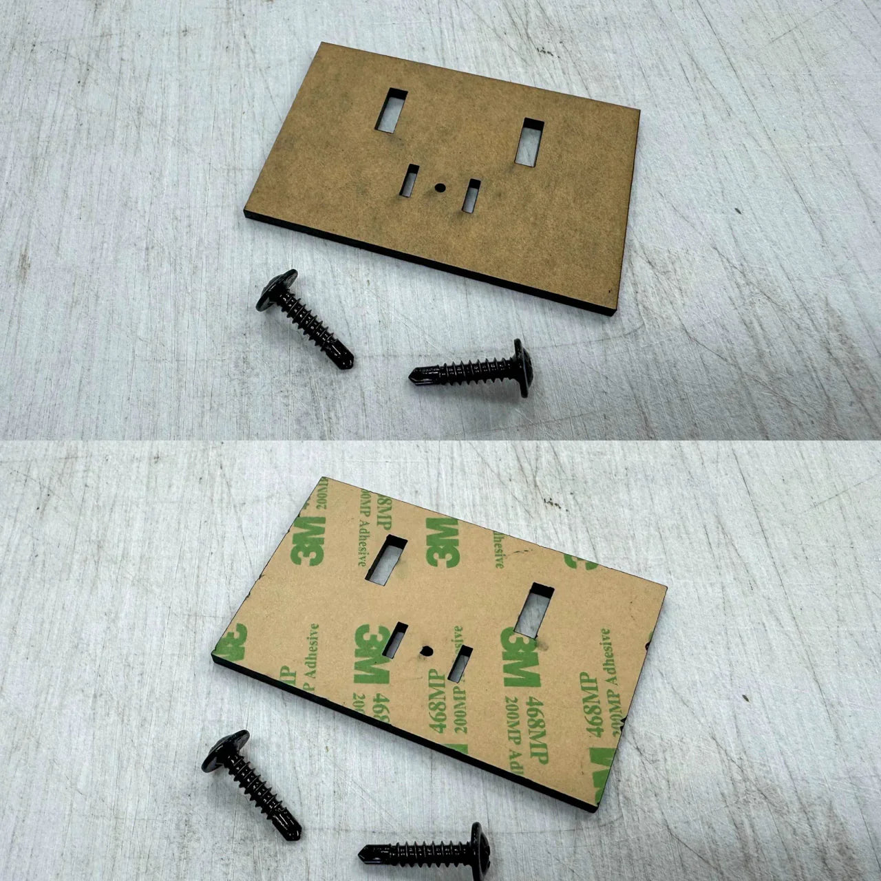 This custom plate is adhesive backed and slotted for the Wolfbox rear camera mount. It drills into a plastic headliner mount with included self tapping screws. This also fits a variety of other cameras.
