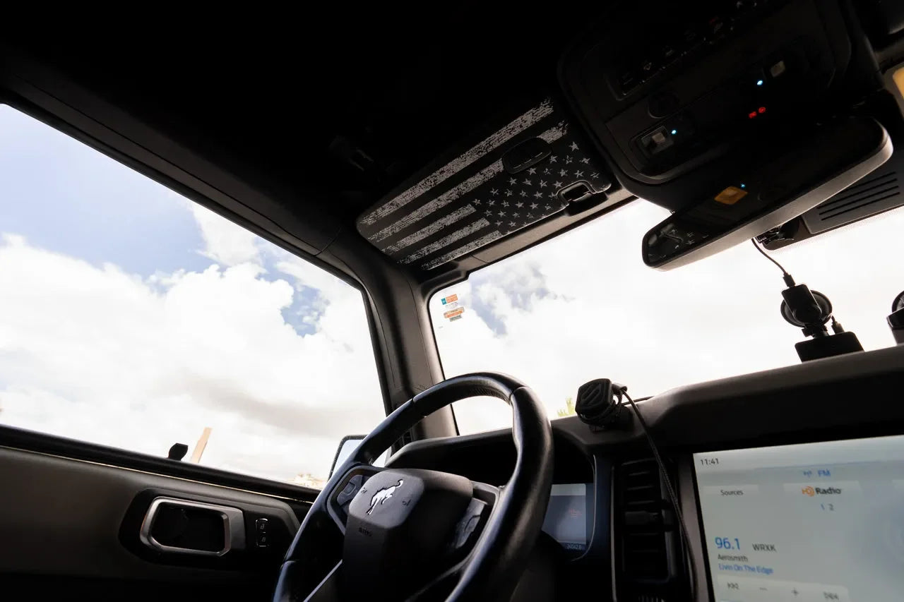 This freedom flag theme is a popular choice for off-road vehicles. It was requested by one of our customers. The sun visors come with labels that detract from the interior design of the vehicle. This is the perfect solution to dress them up. Visible from the inside when they're stored and the outside when they're in use.
