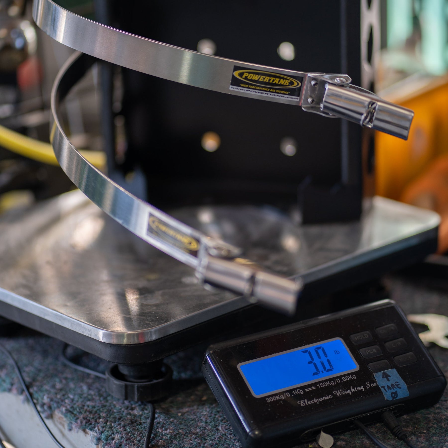 The frame is powdercoated satin black with rubber trim and bumpers at all major contact areas of the tank. The strap is stainless steel and features an adjustable quick release latch. All rivets are stainless steel for a sure, corrosion-free connection. The inside of the strap is lined with a rubber padding to protect your tank. The latch does allow a lock to secure your tank from theft.