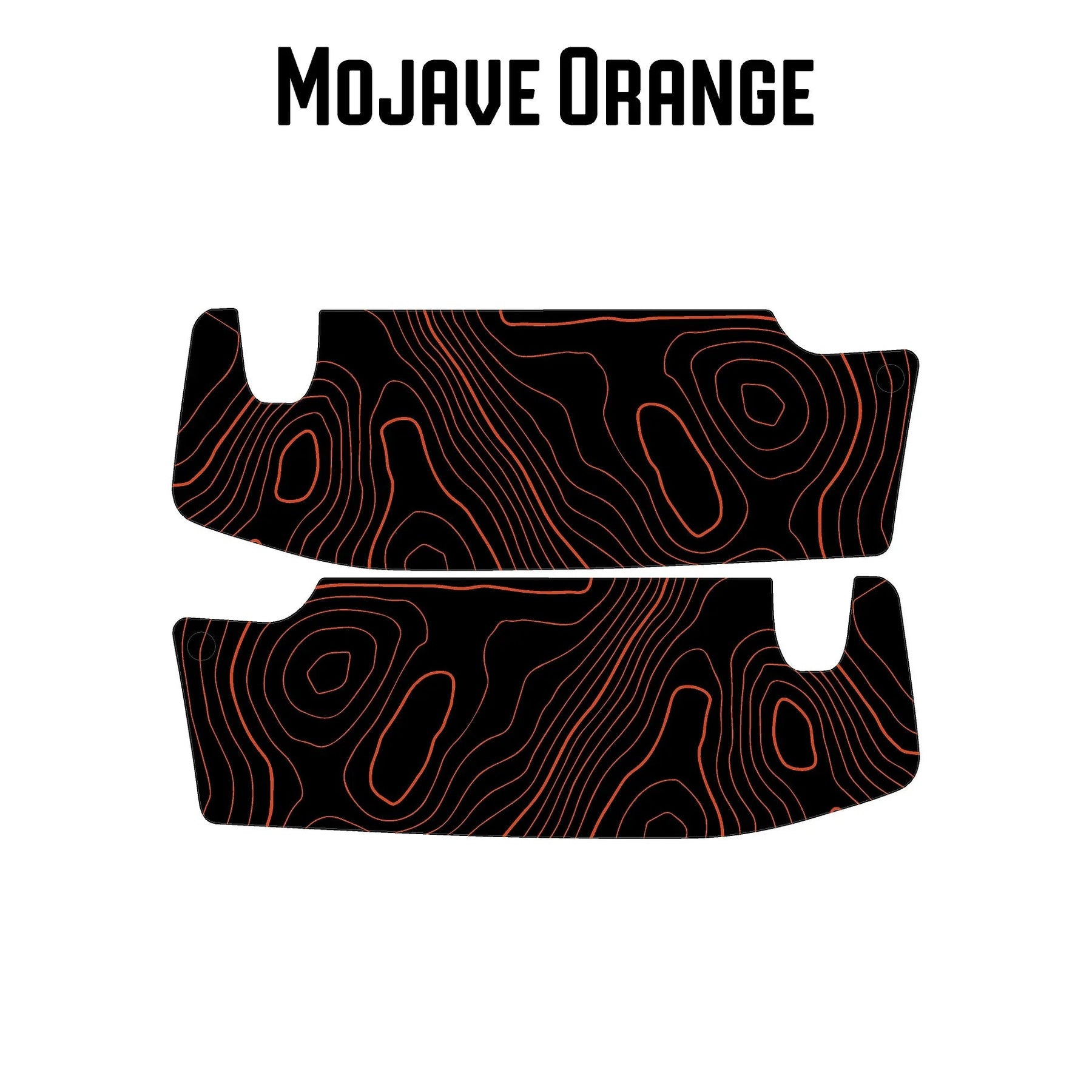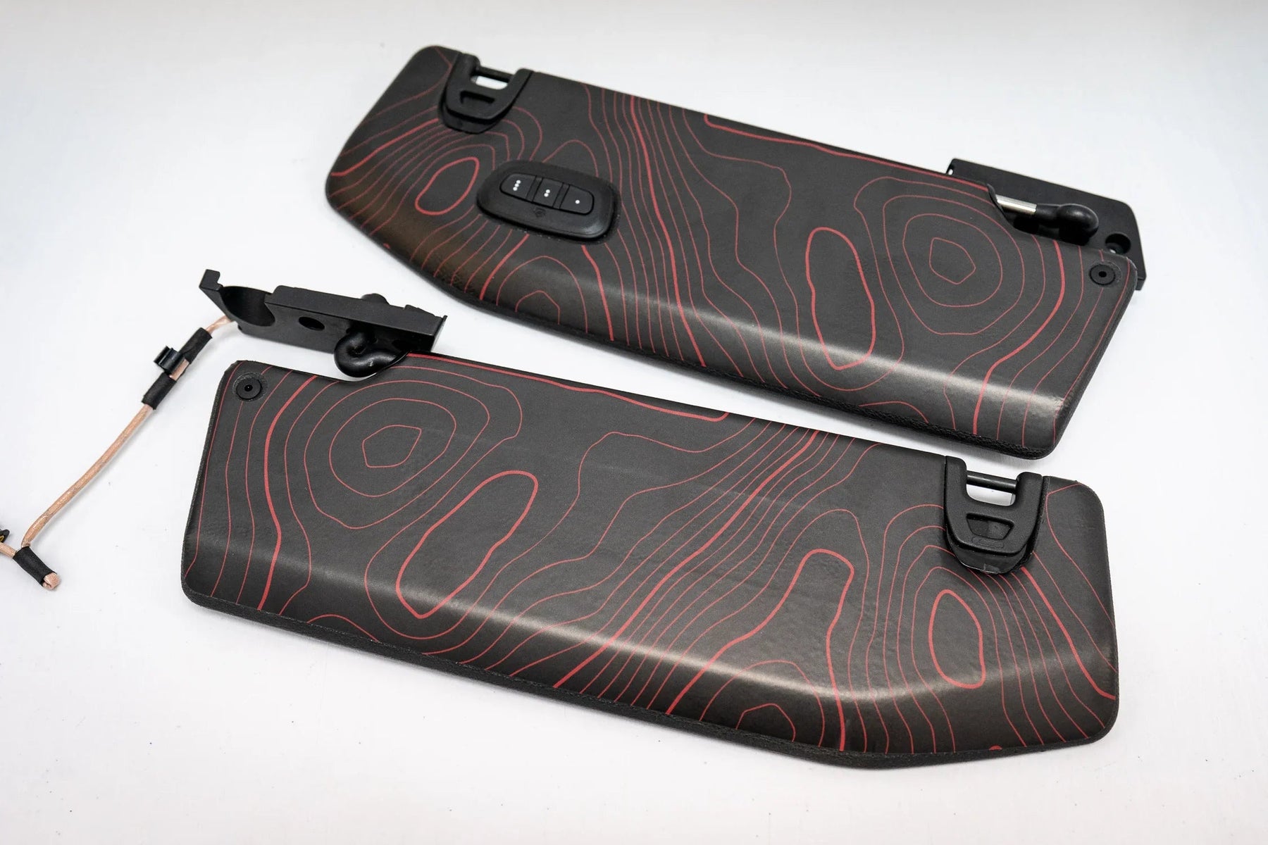 This topographic map theme is a popular choice for off-road vehicles. It was requested by one of our customers. The sun visors come with labels that detract from the interior design of the vehicle. This is the perfect solution to dress them up. Visible from the inside when they're stored and the outside when they're in use.
