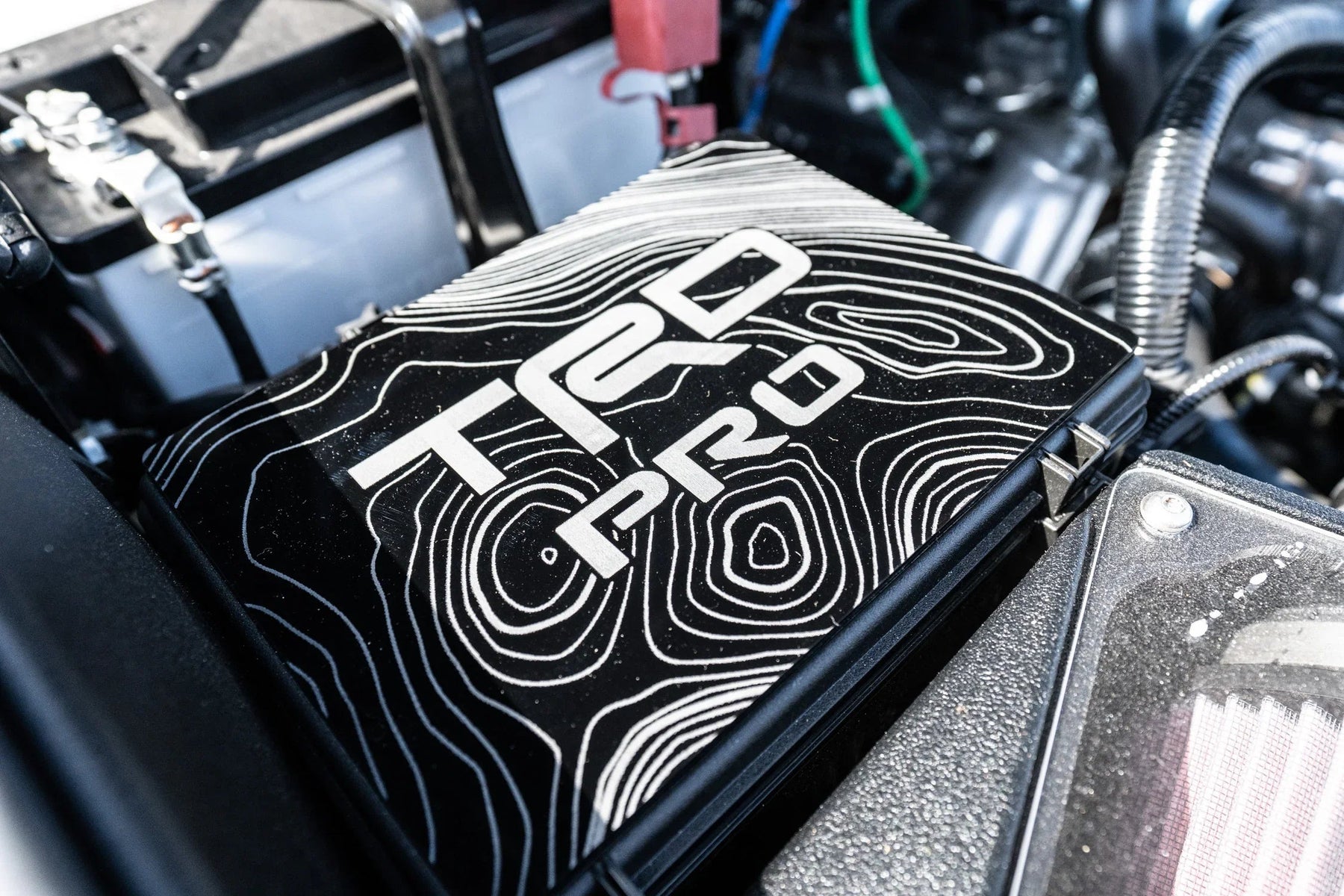 This neat under hood decor shows off the TRD PRO logo and a topographic map design.